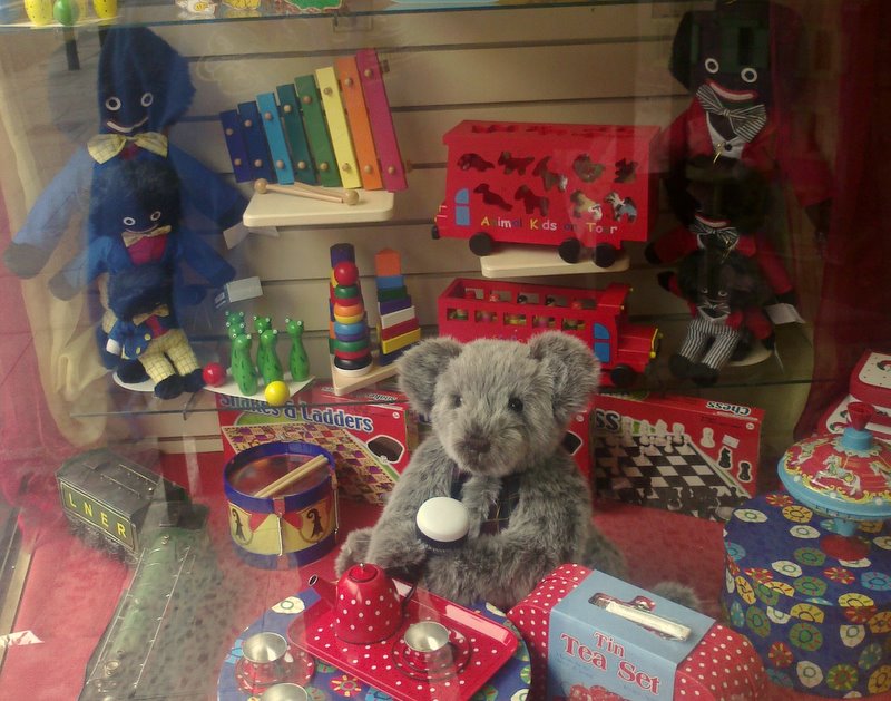 The display of the dolls is not inherently racist. These dolls existed, and were an embodiment of racism, but does that mean they should be forever hidden away? I don't think so. As long as the shop's owners are not endorsing the dolls as tools of racism, then the display of the dolls can only be at most, a representation of a history that should not be denied, as well as one that should not be repeated.