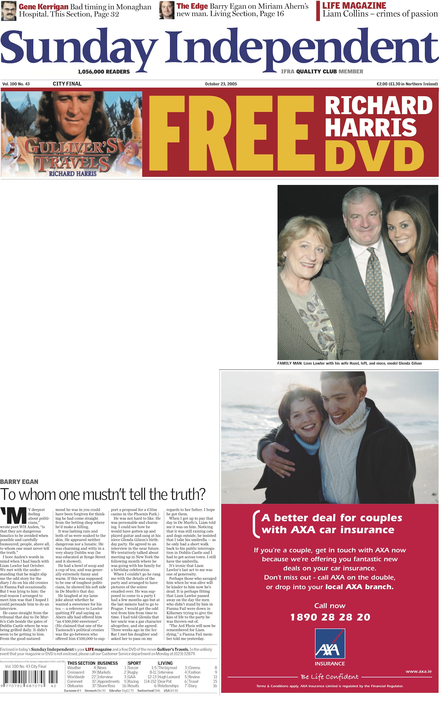 CLICK TO READ - Sunday Independent Oct 23, 2005 - white space is where article was - see 'family man' photo caption that includes Lawlor's wife and obligatory sexist addition, Glenda Gilsen