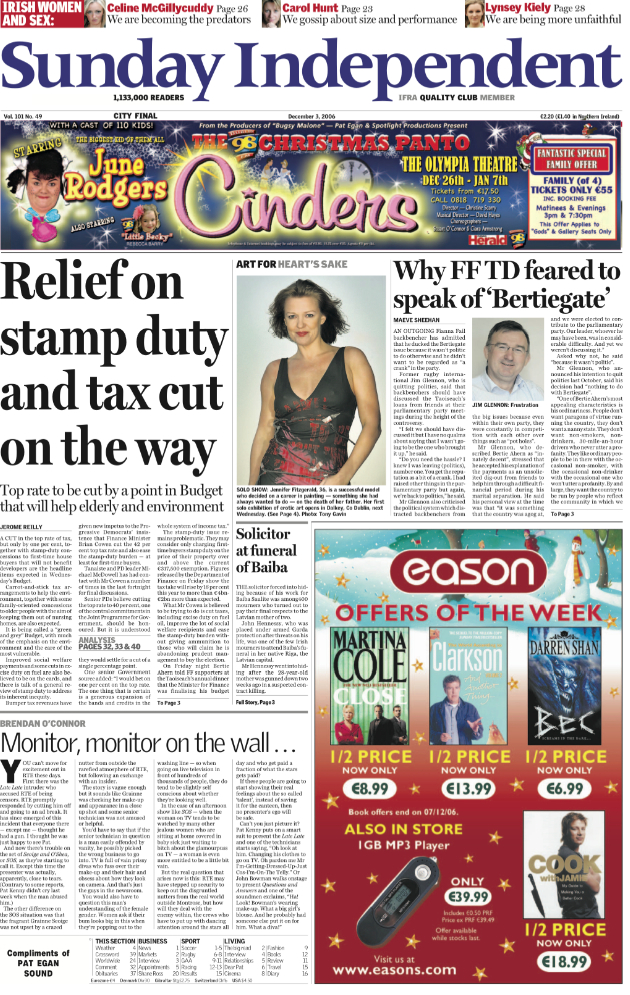 CLICK TO READ - Sunday Independent Dec 3, 2006 - how it is supposed to be - cutting top off top tax rate and heating up the housing market by abolition of stamp duty - those were the days