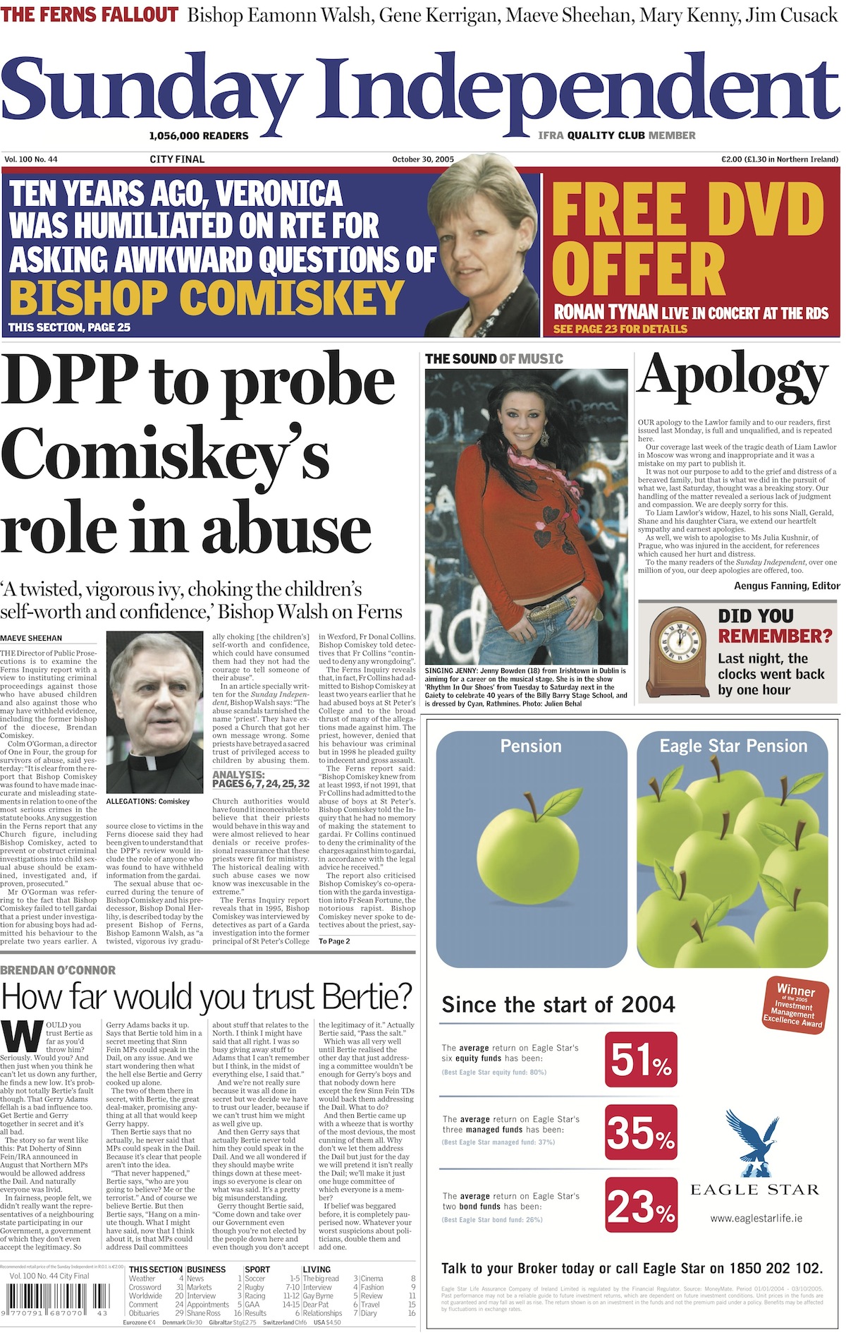 CLICK TO READ - Sunday Independent Oct 30, 2005 - contrast size and design of self-serving 'apology' with previous week's story - no heads rolled
