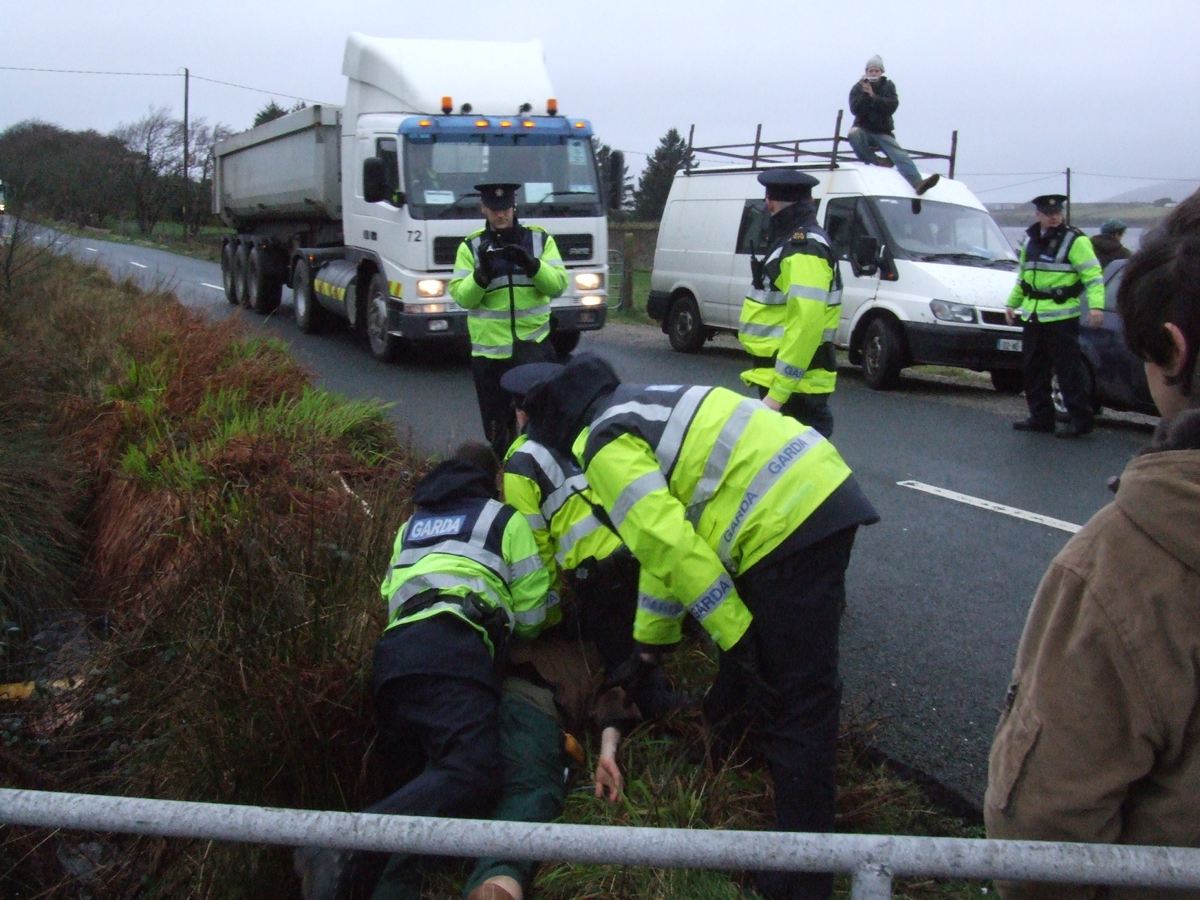 We are paying over a 100 thousand euro to the gardai who protect Shell, this is wrong for a start. One of the biggests companies in the world and they do not need to employ thier own bouncers, why should they, our own gardai are doing a great job for them. The only country in the world where protesters have been peaceful, the gardai should be grateful for that alone, so why are they using the rough tactics again the people, they should stand aside and let the people protest....unless there is some hidden agenda between government, judges and Shell. That I could well believe. Good luck to the people involved and imprisoned, and hopefully many more will get involved with you. You are doing this for all the citizens in this country, keep up the good work. Our legal / justice systems stinks.