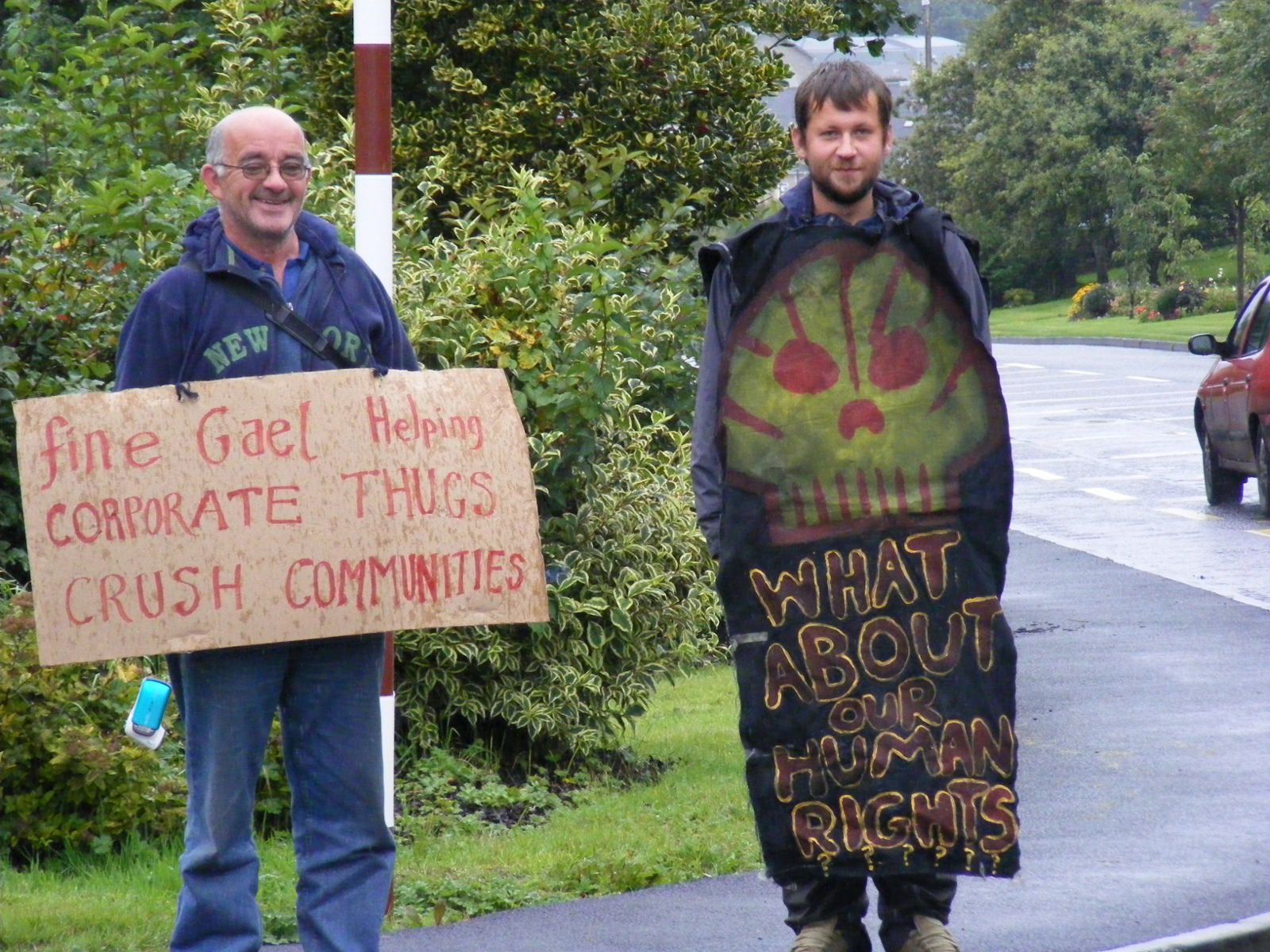 Monday saw a group of protesters- equipped with banners- braving the early morning drizzle at the gates of Knockranny Hotel Westport, where Fine Gael planned to have a party ‘Think-in’ later on that day.