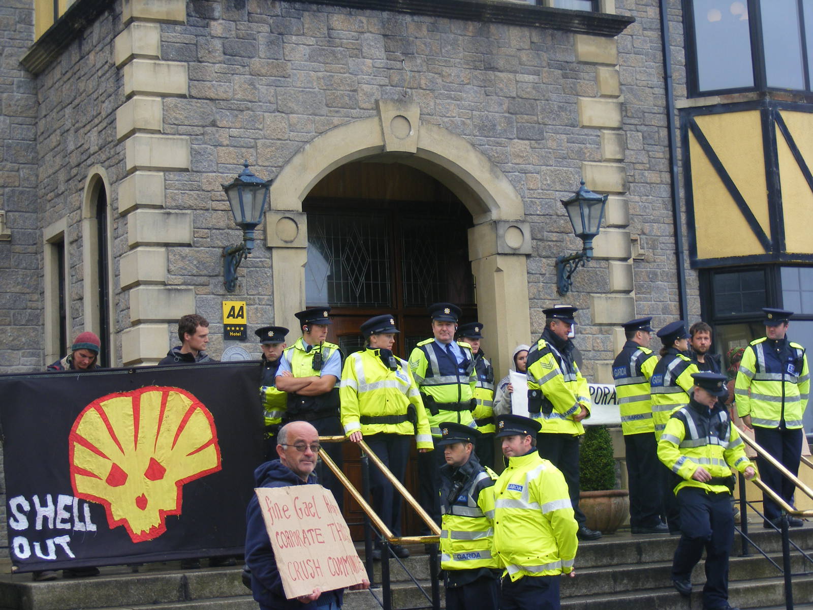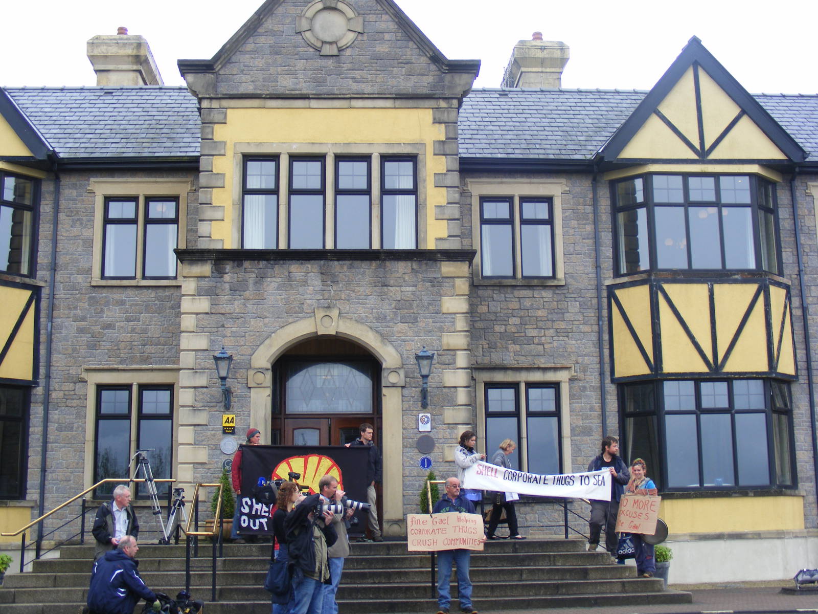 On Monday (10th Sept) Members of Rossport Solidarity Camp and Shell to Sea, occupied the steps of Knockranny hotel, to show their outrage with Fine Gael TD’s for turning a blind eye to the plight of a small rural community at the hands of Shell’s tyrants.