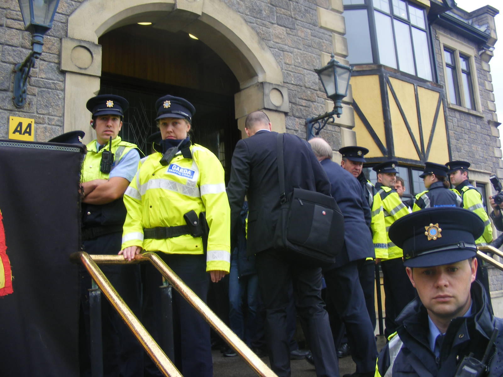 Half an hour before the party arrived, the group of protesters had confused the security by charging over a grass bank some distance from the main gates (which were guarded by Gardai) and marching triumphantly up the steps, past the gawking media and into the main lounge of the hotel, banging pots and pans with a potato masher. The commotion attracted a large number of cops who charged down the main staircase and escorted them out.
