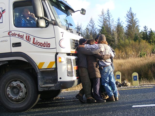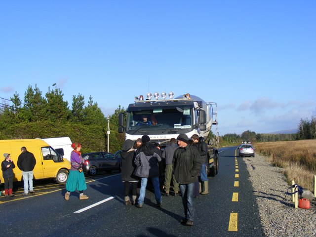 Then a Lennon's concrete lorry working for Shell came along and was duly blocked by the gathering. Eventually two Gardaí arrived at the scene and gave some warnings to leave but they were ignored. About an hour later a Carey's lorry came from the Bangor direction bearing a teleporter, which also was blocked.