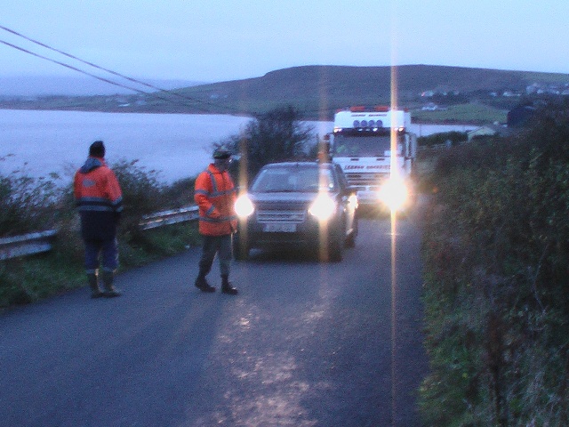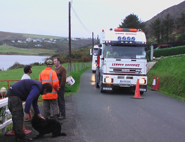 After a few hours down in the field we headed for home. Over the hill in Pullathomas we met a few friends on the road and just as we stopped we spied another convoy of lorries approaching with a new load for Glengad. There was nothing for it but to stop them - putting a Mayo County Council traffic cone to good use for once. All they had was an IRMS jeep escorting them, and they've no legal power on the road.