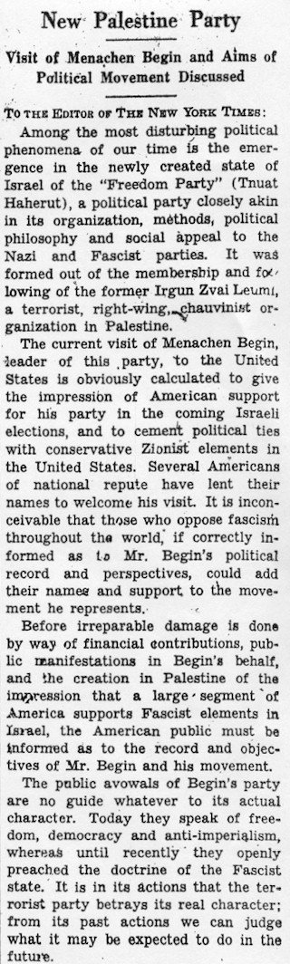 These terrorist gangs got most of their financing from the US, just like today, and in one case, the Lehi (Stern) terror gang contacted Albert Einstein and asked his help in raising money in the US. Einstein’s reply came one day after the massacre of Deir Yasin: he refused to help “calling the Stern Gang terrorists and misled criminals”