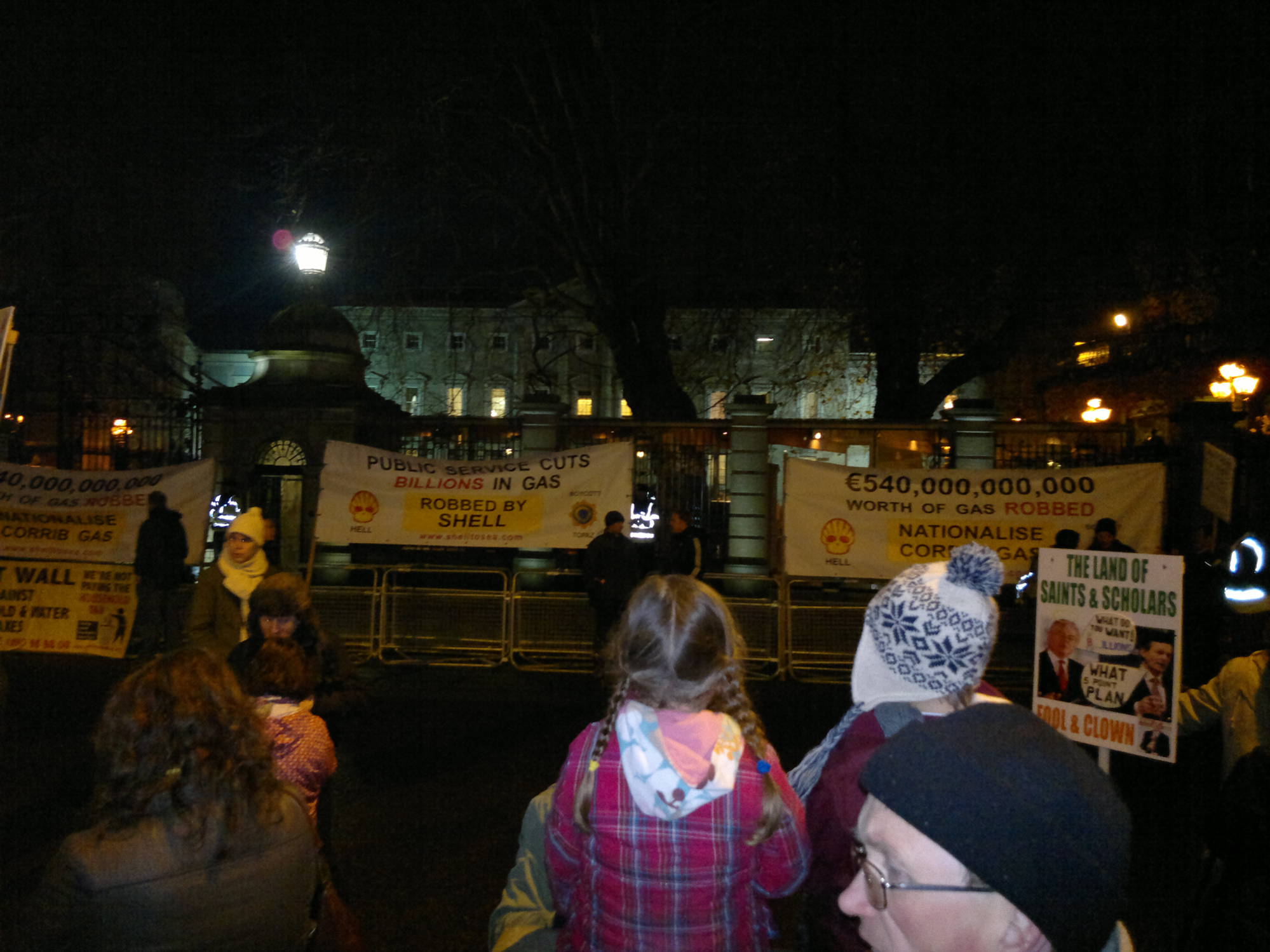The Banner Brigade from Mayo were once again outside the muppet puppet house yesterday from noon until late. The cops cited a Section 21 order which they claimed was signed by Gannon of Pearse St station (known as 'Soap the Rope' during his time as Shell's cop in Mayo) to clear the space outside this bastion of proto fascism - when asked for sight of the claimed order the response was the usual - get out or you'll be arrested. As it happened, the Banner Brigade maintained their blanket coverage at the front of the muppet puppet house which meant the state broadcaster couldn't do any outside reports from there given the dictat that the giveaway banners cannot appear on any RTE coverage!
