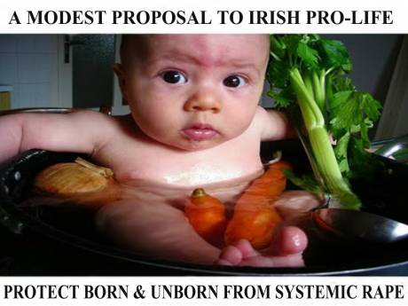 I have been assured by a very knowing American of my acquaintance in London, that a young healthy child well nursed is at a year old a most delicious, nourishing, and wholesome food, whether stewed, roasted, baked, or boiled ...” Well the Americans haven't changed their thinking and thy're still dictating pro-life policy in Ireland.