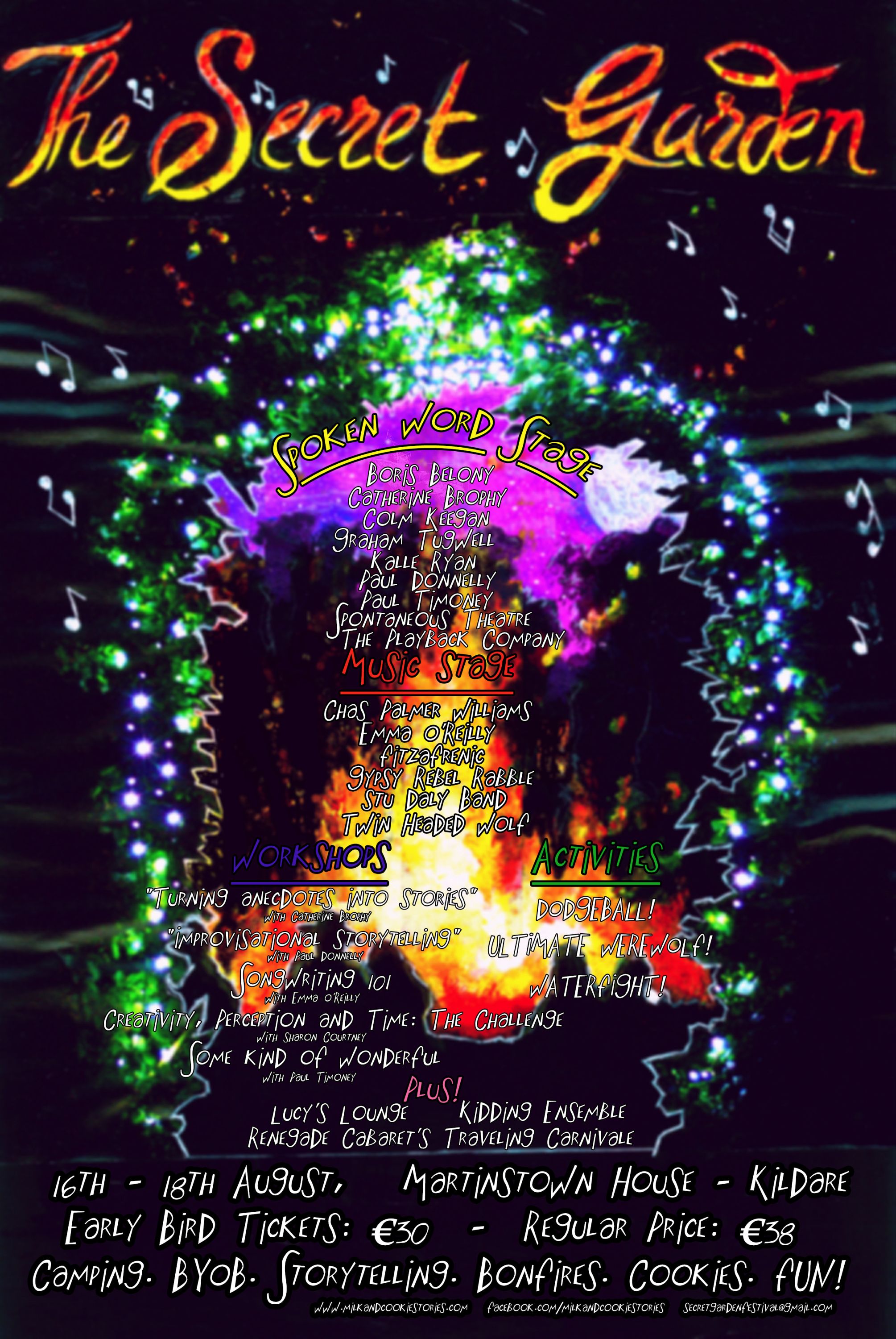 The festival is a mix of storytelling, poetry, music and performing arts - including theatre, magic, circus and acrobatics. (For the full list of our acts this year you can see the attached poster or check out our detailed event notice here - https://www.facebook.com/events/199922520160883.)
