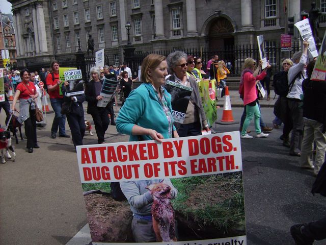 Anti-blood sport campaigners joined various animal protection groups outside Dublin Castle to protest at the exempting of blood sports from prohibition under the Animal Health and Welfare Act. Other groups were there to promote animal friendly lifestyles and to highlight cruel animal transport practises.