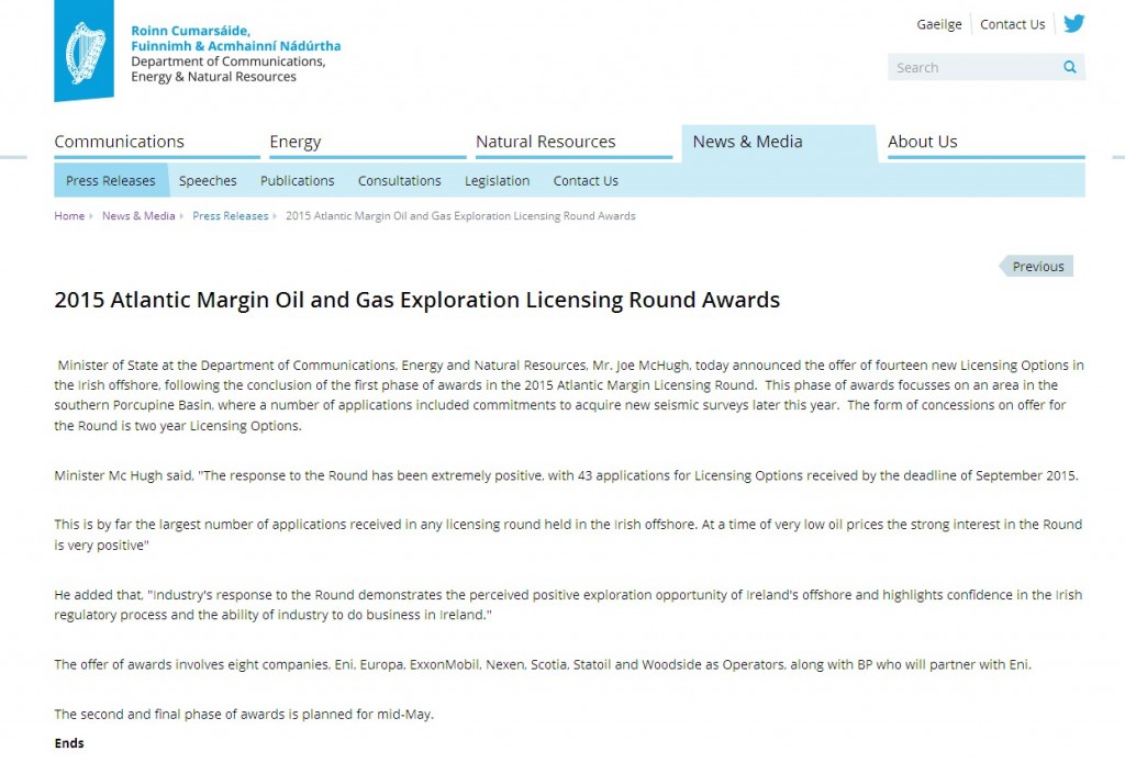 http://www.dcenr.gov.ie/news-and-media/en-ie/Pages/PressRelease/2015-Atlantic-Margin-Oil-and-Gas-Exploration-Licensing-Round-Awards.aspx# Headline from RTE News - Exxon, Eni and Statoil win Irish offshore licences