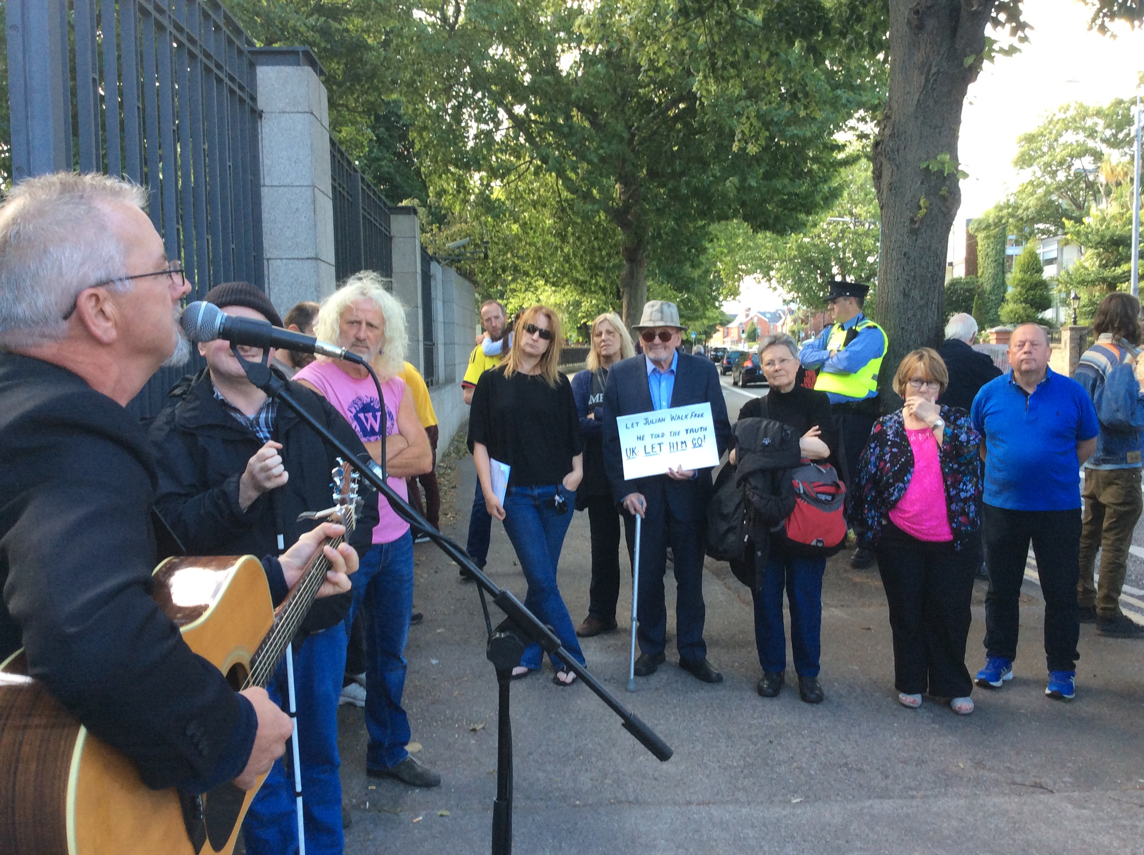 The Dublin protest outside the British Embassy, began at 6 pm and was addressed by Mick Wallace TD, Clare Daly TD and Mairead Maguire, Nobel Peace Laureate. All three had visited Julian in the Embassy in London when he was free to receive visitors. The equally redoubtable Paul O'Toole and Robbie Sinnott provided the song and music.