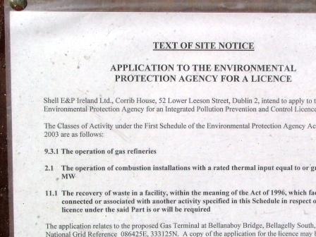 At the same time you have what is an unprecedented high pressure pipeline running through the villages of Glengad, Rossport and Gortacragher and well this pipeline; the difficulty here at the moment is to get the message out to people who have only a passing knowledge of this, this pipeline is not like the Bord Gais pipelines.