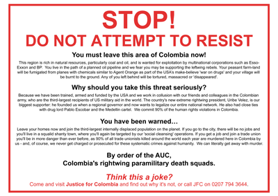 Knowing this perfectly well, they went ahead and campaigned against the boycott and handed out those leaflets. The people who did this can't complain if people call them "scabs". They were campaigning against a group of trade unionists who were facing threats to their lives. Who are you, as an Irish person who has never had to face threats of that sort, to tell Colombian workers that they shouldn't call for a boycott? If it's unacceptable for a student to tell Irish Coke workers what they should do, it's certainly unacceptable for any Irish person to tell Colombian trade unionists what they should do.