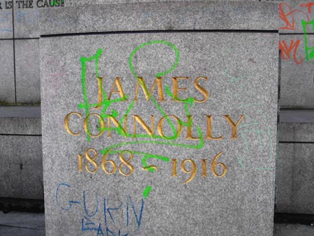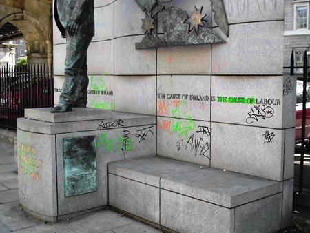 I can't believe that you people are trying to defend the defacement of a national monument as some kind of statement on trade unionism or marxist Ideals. This monument belongs to the people of Ireland and the audacity of a bunch of egocentric revolutionary wannabes defacing the statue of a true Irish hero is disgraceful. I'm sure if you asked the majority of the 'people' you supposedly are trying to represent they would agree with my assertion.