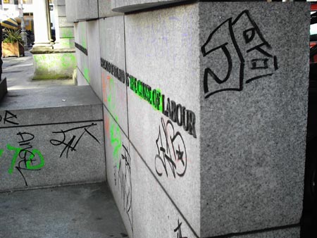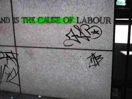 Some of the green spray was used to try and alter the official slogan of the monument on the wall behind the statue which runs "The cause of labour is the cause of Ireland - The cause of Ireland is the cause of labour". It's a slogan that has always seemed problematic to me. First of all it suppresses the fact that Connolly was a raging marxist revolutionary. "The cause of labour" might have connoted raging marxist revolutionaries in Connollys time but nowadays it's just as likely to suggest Tony Blair. The slogan also emphasises Connolly's habitual placement within the nationalist tradition. A tradition likely to alienate him to as many as it endears him to on the Irish left. The monument itself isn't half as radical as Connolly actually was and when this fact invites some squabbling in the form of spraypaint then that's fine by me. Even if a lot of the paint is just someones tag, they're only engaging with the statue on its own terms of personal branding which is probably a tactical error but not exactly a moral one. Like the chalk, the paint too will wash off in its own time long before the statue crumbles. I'd suggest that no one bothers trying to speed the process, it would merely be an act of impatience. Who knows, the "uglyness" of the graffiti may remind us of the uglyness that SIPTU has become across the road, something Connolly surely would have more of a problem with than the subversion of a public monument...even if it is in memory of himself.