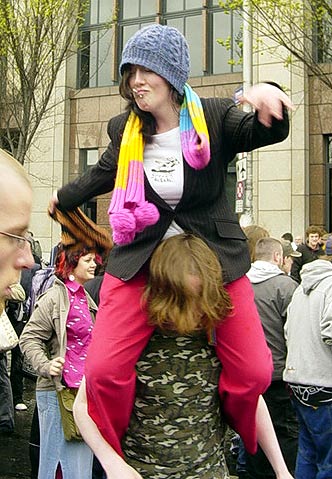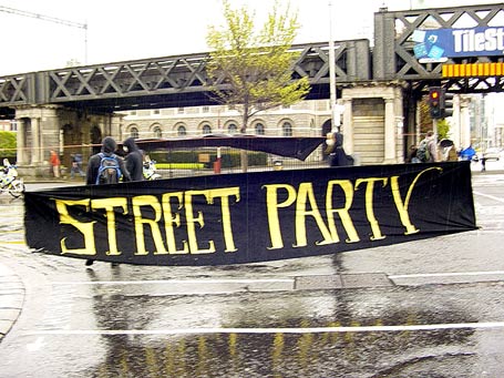 I don't think there was any disrespect meant by putting the mask on Connolloy, in fact I think it was affectionate more than anything else. I was chatting one of the lads who did it and thats how it came accross anyway. I really liked the whole location actually, like masking Connolloy it was a conscious attempt to link with the more traditional Mayday celebrations and I thought it was a cool idea to stage it in the same area as Saturday's march.