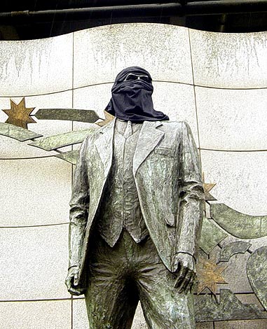 The improvised black mask is synonymous in Western activism with anarchism. It seems but a small leap to interpret the masking of Connolly as an anarcho criticism of making celebrities out of dead revolutionaries. It's an interesting variation on the Churchill action in that they both imply a criticism of societies moribund habit of stressing the importance of dead people. Of trying to transform politics into a passive spectation of historical figures. It's a subversion that says all tradition is undermined by the present. That the time for revolutionary leaders is over, now is the time of the faceless revolutionary.