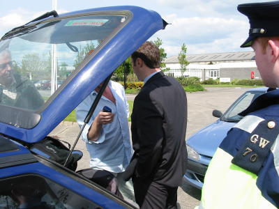 I arrived at the industrial estate beside the airport to see former Irish Army Commandant Ed Horgan’s car stopped in a public place outside the perimeter of the airport and surrounded by a police car, 2 police vans and an unmarked special branch car. After Ed tried unsuccessfully to hand a written request for the arrest of American President George Bush to a Garda Detective, I watched as the detective and a guard opened and searched the boot of Ed’s car and his personal belongings without Ed’s permission, as more guards stood by watching.