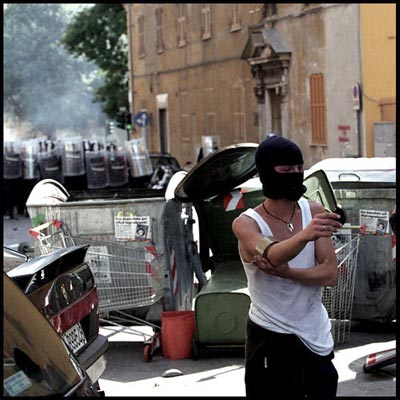 There's the usual words being thrown around in all the releases and statements saying the protests will show "solidarity", "resistance", "opposition" and how this amazing campsite village will be a working model of a perfect society, blah blah etc etc. There's no mention of the other aspects of summit protests, which always happen - fear, paranoia, panic, hurt, arguments/disputes, violence, arrest, and yeah - maybe even death. I think there's a certain degree of honesty missing about what going to a G8 summit entails in all the literature. Yeah, you'll meet nice people, and you might learn something about yourself, but there is a chance that you could get hurt. This is just an honest reflection on what has happened before. I dont know if people ask themselves real questions about getting involved. Did the thought ever enter Martin Shaw's head that they might actually cut the rope? (IMHO that was one of the most incredibly badly thought-out direct actions of all time) Maybe. Did Carlo Giuliani think he was going to be shot? Maybe. If visited from the future though and offered death or paralysis while taking part in an anti-globalisation protest versus staying at home, I am sure which one I'd pick (sorry, but I dont want to die for "anarchy" or any other political ideology quite yet).