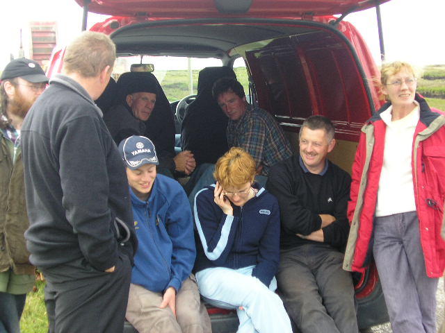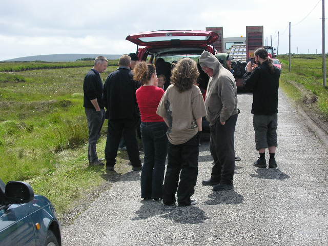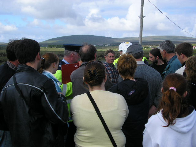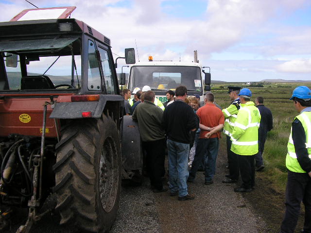 As a result of the actions of local residents and their supporters most transport to the Shell compound at Rossport has ceased. At mid-day today (June 24th) some Shell and associates top brass started poking around, and seeing that the numbers of residents and their supporters had thinned they attempted to make their move. By 2pm today, Friday, a flurry of Shell henchmen was at the scene waving the High Court Injunction order they had got in Dublin that morning. This named Willie Corduff, Vincent McGrath, Philip McGrath and enjoined them, and anyone acting in concert with them, from “interfering” with traffic. However the only obstruction to traffic is from the contractors hired by Shell, normal traffic can transit the road with little difficulty. At the moment any obstruction is from the now very stationary lorry which was bringing pipes to the Shell compound. At around 3.30pm Garda were called and served the injunction, reading it out to the assembled crowd of around 30 people, who were unimpressed at the law not being applied to the developers, while local residents are tried in absentia in Dublin. The police were told straight out they would have to cart people off the road in wagons, that they would have to arrest everyone in sight. The legal situation with lorry, which is unlicensed to carry materials, was pointed out to them, but they said that it could be driven off and that the new driver had ten days to produce the necessary documentation. Mostly the Garda just pleaded that they had orders from the High Court, the highest court in the land and so on… Negotiations began, the three-way debate ended inconclusively as Coffey, on behalf of Shell and co., didn’t have the power to organise a full scale public meeting open to all the people who use the road, rather his brief was, he claimed, only to organise a meeting of 3 Shell reps and 3 local residents, moreover he aimed to restrict participation to the owners of the land where the pipeline is planned to go. Frustrated the Garda left, and, according to what is by now legend, worked out their stress issues by pulling over some Eastern European migrants for having no tax and insurance. Shell-Statoil-Roadbridge-Sicim then attempted an abortive move of the lorry, unsuccessful in this, they then tried parking it further off the road, in order that the road be passable for their other lorries. Not the smartest of moves as this then got the truck bogged down. So the main-contractor successfully sabotaged the sub-contractors machinery, one would say – only in Ireland, but as there are Italians, Germans, Englishmen, Norwegians, Americans etc… with a slice of the development cake here perhaps such happens everywhere, but it is sure a new one on me. The mood here is very positive and has been the last few days, there was a bit of a party last night with the bonfire for St.John’s Eve, with the Wolfe Tones making a change from some radio station that only seems to play country.