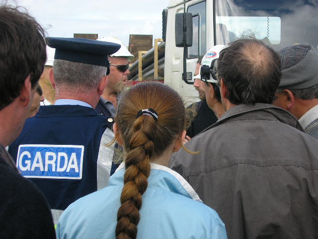 At mid-day today some Shell and associates top brass started poking around, and seeing that the numbers of residents and their supporters had thinned they attempted to make their move. By 2pm today, Friday, a flurry of Shell henchmen was at the scene waving the High Court Injunction order they had got in Dublin that morning. This named Willie Corduff, Vincent McGrath, Philip McGrath and enjoined them, and anyone acting in concert with them, from “interfering” with traffic. However the only obstruction to traffic is from the contractors hired by Shell, normal traffic can transit the road with little difficulty. At the moment any obstruction is from the now very stationary lorry which was bringing pipes to the Shell compound.