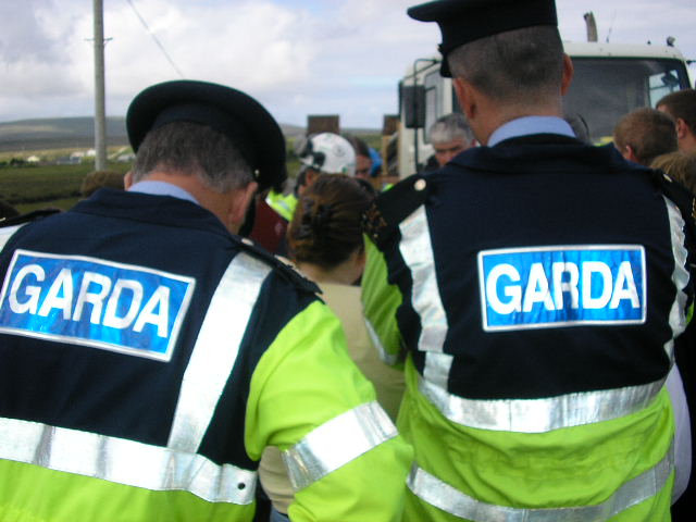 At around 3.30pm Garda were called and served the injunction, reading it out to the assembled crowd of around 30 people, who were unimpressed at the law not being applied to the developers, while local residents are tried in absentia in Dublin.