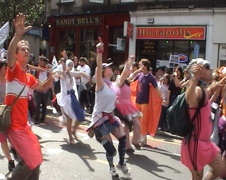 ![]() Large But Quiet and Sedate Demo. A report from Edinburgh and a few pics lifted from film work in progress. There were thousands of people heading to the Meadows around 9.30am, still a good bit before the scheduled kick off. The usual gauntlet run of flyer-handers, paper sellers, petition urgers etc had to be negotiated on the slope down to the convergence area. A few minutes before the march was due to kick off, a crew of roughly 80 (seemingly comprised of many Irish Dissent! people) poured down the incline, masked up and dressed in black, visibly adrenalised, and shouting obscenities within earshot of many young and old sensitive liberal ears. "Commandante W" as I belief he is referring to himself as was in flying form, obviously in his element! They had been tailed for a while and the spotlight was on them, they disappeared around the corner towards the entrance point and that was the last I saw or heard of them until later in the afternoon... The demo managed to get moving just after the appointed time of 11am. It was being led by a black samba band and some 'dignitaries' types who I did not know, one of them had mayoral chains on, so possibly the Mayor of Edinburgh? Who knows, if Gordon Brown was invited along then its quite possible. The media scrum was incredible. Every photographer, video crew, audio journos were falling over each other to document what was happening.As the march reached the turn of Bath Street, there was a slight commotion straight up ahead and the police radios, which had been silent up until this time, crackled angrily into life and the luminous yellow jackets were running up to the front of the march. The media scrum had moved too, flashing and pointing at the percieved 'trouble' (and yes, I too was admittedly following it...) A group of "pro-capitalists" had assembled in front of the head of the march, and had signs emblazened with slogans such as "Blood For Oil" and "Make Poverty Permanent", and were chanting slogans such as "Free Trade not Fair Trade!" and "Down with equality!" The Police initially did not seem to get the joke, and there appeared to be a bit of scuffles between some of the creative/subversives and stewards trying to clear a path for the march. Eventually they seemed to get the joke, people were only dressing up in suits and chomping on cigars as a pisstake; nevertheless the Police kept an eye on them and escorted them all the way up Princes St. Princes St is one of the main 'high street' shopping malls in the city, many premises were boarded up but bore signs saying 'open for business'. The march came in waves and waves of people. To be honest I was a bit disappointed with a) the crowd, and b) the lack of creativity. Possibly a and b are related. The crowd was announced later on in the meadows as 200,000, no laughing matter but well short of Geldof's million. Maybe they are due on Wednesday. The reason for my lack of enthusiasm for the march was the non-diversity of the participants. It seemed to be mostly people out for the day with their young kids. Not that that's a bad thing - but it just meant that the march was deathly quiet for very long periods, and everyone was holding generic placards thrust into their hands. Distinct, individual creations (which are always, always much better) were thin on the ground. There wasnt much representation from unions or refugees, or not visible at any length. There were no 'blocs'. Certainly a very different demographic from say, the Saturday march in Genoa 2001. Many of the people I spoke to were quite bubbly and happy with the day. They all spoke of how deaths in Africa were terrible and how they should stop. My cynic motormouth almost jumped at the question "well how do you think marching around is going to achieve anything?", but today I kept shtum and tried to soak up some of their optimism, if naive in my eyes. The sun was baking me and I was nearly at the end of the march already (a short enough walk for a march of many thousands, comparable to Parnell Square to Merrion Square), so I strolled back the way I came to check out more people joining in. A good bit back the way, a big pink/radical cheerleader/samba group appeared. Possibly one of the biggest samba groups I have ever seen. The noise was chest-pounding. (Painful) Memories of Genoa came flashing back briefly acid-style, where every idiot with a bongos and a spliff in him would crack the fucking thing out at 1am and continue to hammer out an arhythmic beat for hours until his inner child had been palm-beaten out of him... but this was different. They had class - and practice. It was all in time, the dancers knew their steps, they were working the crowd around them up into a sweaty frenzy. The bass (lambeg?) drums were pounding, and instead of the usual one or two, they numbered maybe fifteen or twenty. I glued along with this for a while before moving towards the back again, mostly to get out of the sun which was now creating a nice Oirish farmers tan for me... Back into the Meadows just before 3pm, and there were still thousands of people queueing up to leave the place and march the route, obviously determined to walk the Queens Highway. There were 3 stages erected, where comedians and musicians were telling bland jokes and playing even blander music. At 3pm, the entire site fell silent for a minute, as the MC said "13 children will die in the next minute" and then started the clock on the screen. At 3:01 there was a huge roar, as if somehow this had made poverty history... the bands started up and played music, and then of course another 13 children died in that minute too, but it was as if somehow the simple act of sitting silent for a brief moment made people happy in their hearts. Sorry to be a cynic about this but I cant help it when you see the likes of Puff Daddy et al supporting this initiative. 20 years ago people probably held a minutes silence for the dead in Ethiopia as well when Michael Buerk's BBC report shocked them 