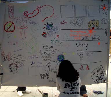 during the last 2 days poloroid photos were taken with people writing their dreams on cards they held up, these photos made up a poloroid photo wall.