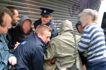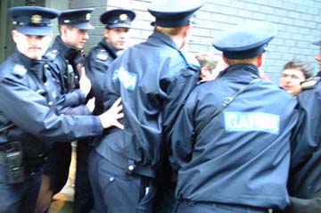 There was a large presence of male and one female guards at the GNIB throughout the afternoon. When they decided that they had had enough of us and that they wanted to do the deportation a large number of them assembled at the back of the building and when we tried to link up and block the jeep that was carrying people in it to be brought to the airport they just went for us. They had us out of the way in seconds and were very heavy handed about it.