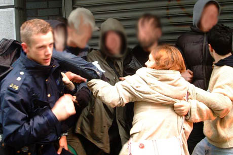 At one stage in the afternoon (sorry I cannot be more accurate on times, was there for over 7 hours) a woman named Meriam Shaka who was due for deportation was dragged out of the front entrance of the GNIB screaming by a male guard in plain clothes. She looked roughly 20. She was barefoot and barelegged having only a small skirt on the bottom half of her body. She ended up in the middle of the road with the male guard handling her extremely roughly. She was lying on the ground kicking and screaming. She was being dragged from the road to the footpath by this male guard. She seemed to go unconscious and her eyes were flickering. It was unclear as to whether she was gone unconscious or into sever shock or was having a seizure. More male guards came to the scene and were told by the plain-clothes guard that she was "only messing". People came running out of nearby buildings to come to her assistance. The guards refused to allow people to give her First Aid. The guards also at all times throughout this incident refused to give their names and numbers which is completely illegal. A female guard appeared at the scene and she seemed to be the only one who was interested in following any form of garda protocol. She requested that another female guard be brought to the scene so that they could lift the woman. The guards refused to bring her to the hospital and instead threw her into the back of a garda riot van onto the floor of it and brought her to Pearse Street Garda Station. One man who was an onlooker, who went over to the station to ask how she was and to complain about the abuse she had suffered at the guards hands was arrested at the station. Meriam was not deported last night.