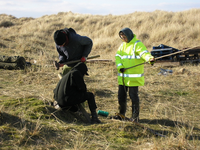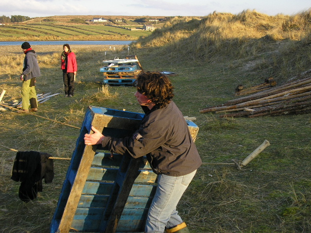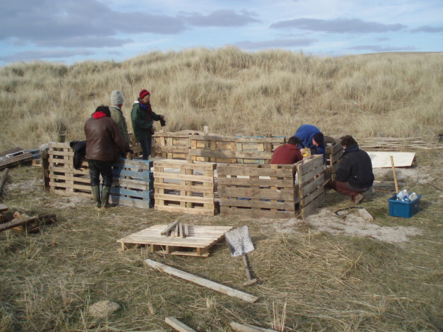 This weekend’s work saw the camp marquee being pitched among the dunes and several benders being constructed. A grey water system, fire pits and composting facilities were also built and pathways were cordoned off through the dunes to prevent their disturbance. Willie Corduff helped to move materials to the campsite using his tractor and trailer and several other locals including Terence Conway, Ray Corduff and Sean Harrington to name a few joined with campers in the construction. Delicious vegan food was prepared by the Bitchin’ Kitchen radical cookin’ collective.