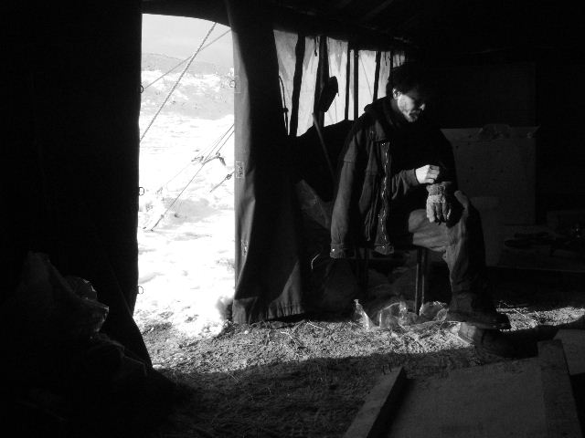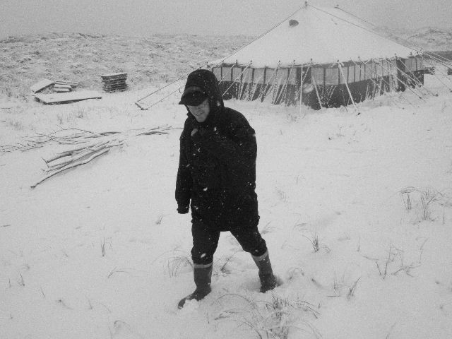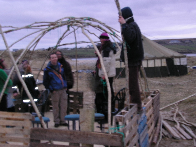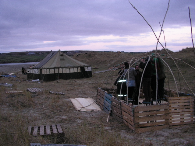 Do not confuse the Solidarity Camp with one of Ireland's many summer festivals. This is a serious place with a serious objective. It can also be a fun place, a place to have the craic, meet your mates and swap stories, and a lovely place to hang out, but don't forget, there is work to be done. The camp was not beamed in from outer space one night but has evolved ( and is still evolving) as the consequence of a lot of hard graft by a dedicated few. If you plan to visit, I'm sure you will be most welcome, even if you only want to drink tea and talk about past campaigns ( yawn). But if you really want to help, come prepared. Wear the right clothes for outdoor work and have good footwear for protection against the VERY muddy walk down to the camp. Waterproofs are essential; this is Ireland remember, whatever about the beautiful pics of the camp in the snow! It does rain! On the Mayo coast, the rain is often of the horizontal variety.
