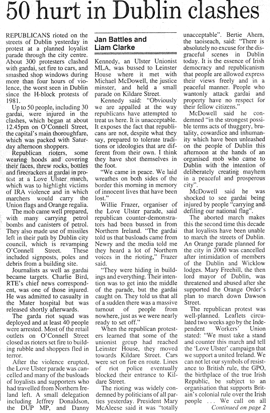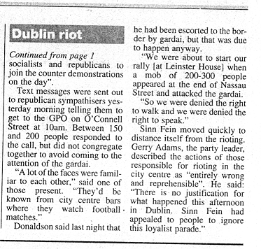 Sinn Fein moved quickly to distance itself from the rioting. Gerry Adams, the party leader, described the actions of those responsible for the rioting in the city centre as "entirely wrong and reprehensible". He said: "There is no justification for what happened this afternoon in Dublin. Sinn Fein had appealed to people to ignore this loyalist parade."