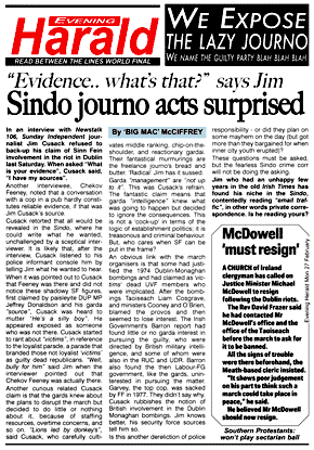 Meanwhile, Tony O'Reilly's crack team of journalists, editors, sub-editors and secret garda sources were busy churning out their own brand of shite which was neatly countered in public by Indymedia Ireland contributor Chekov. The whole fiasco (and similar disinformation spreading in the past) demonstrates what is at best ludicrous inaccuracy, but is more likely a co-opted and broken media model. The Sunday Times' article is now nowhere to be found on its archives, there is no retraction published and we have audio of another Sunday Times editor spreading the lie, this time on the radio. Here on Indymedia.ie we've clearly published the correction that Liam Clarke denies IWU involvement (although his name is on the story). Compare and contrast. Good-bye Grub Street hacks, you're only useful to the government.