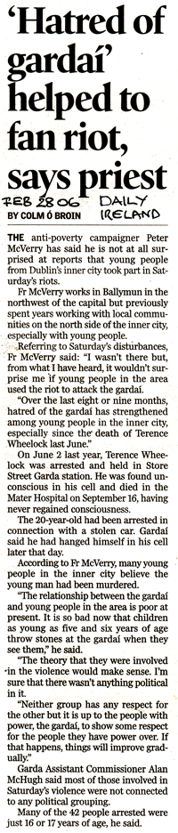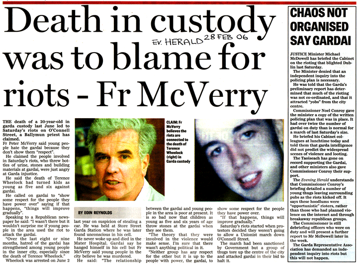 "FR PETER MCVERRY today claimed through a tabliod newspaper the EVENING HERALD that the dissafected youth of dublins nth innercity clashed with the gardai because of the death of the late TERENCE WHEELOCK from summerhill d1.
