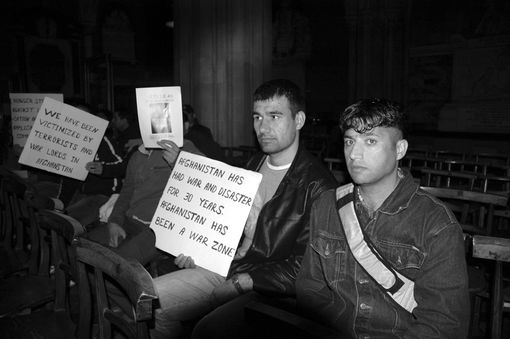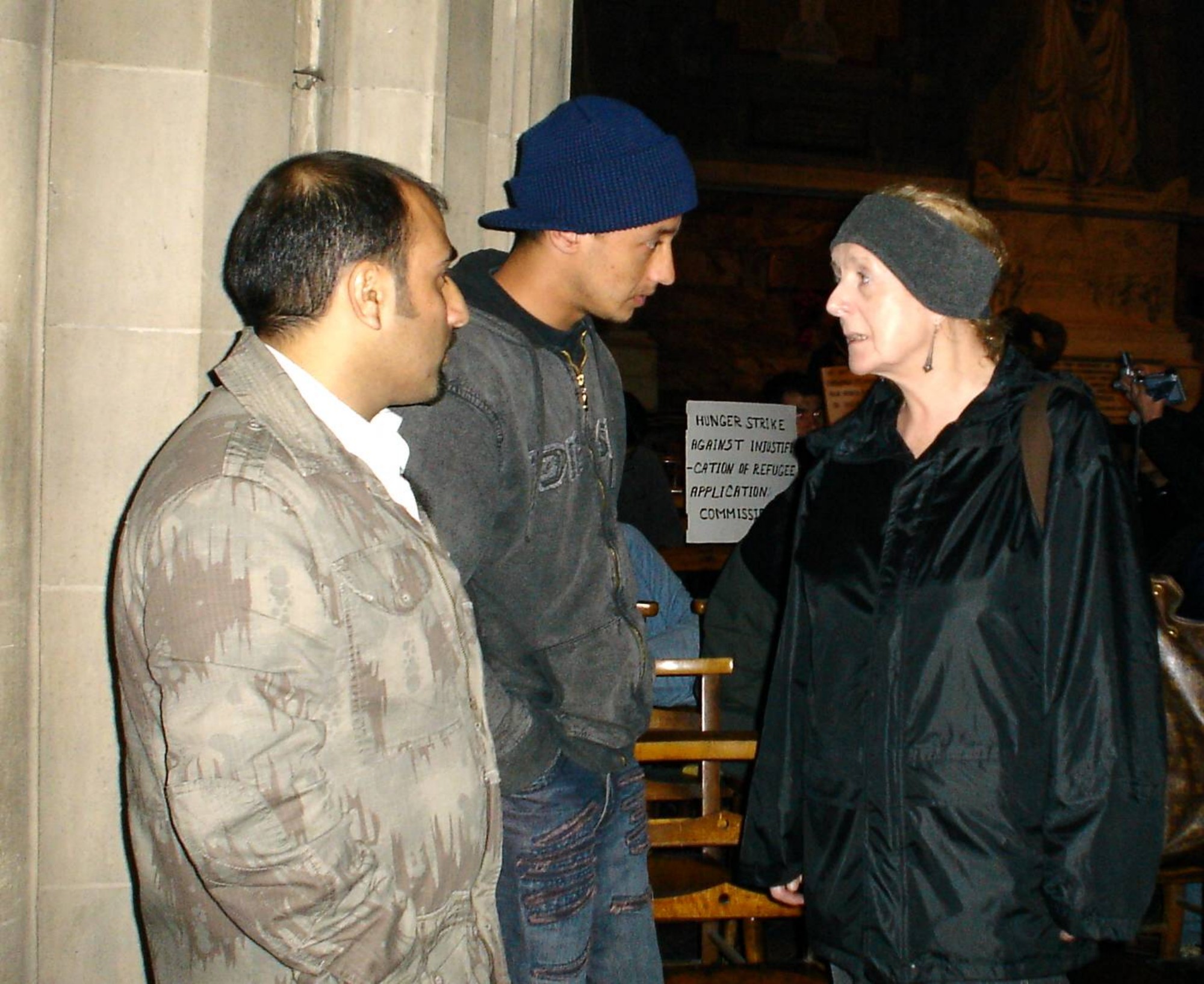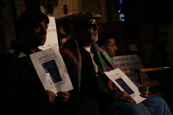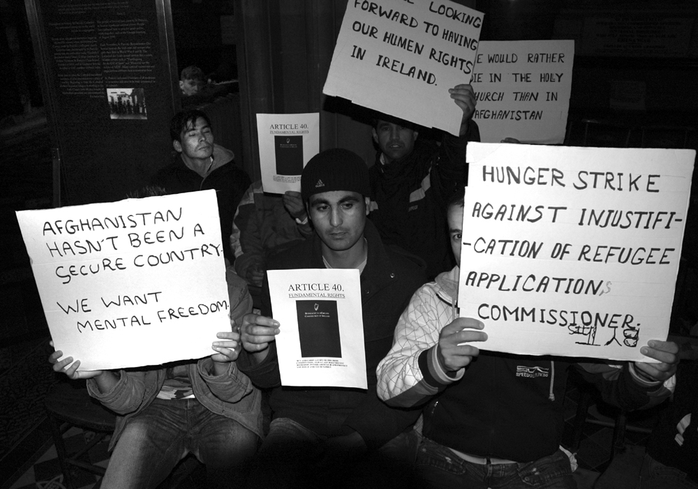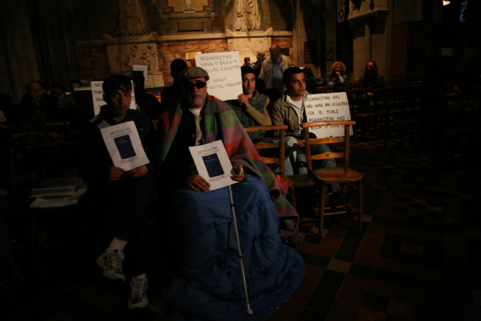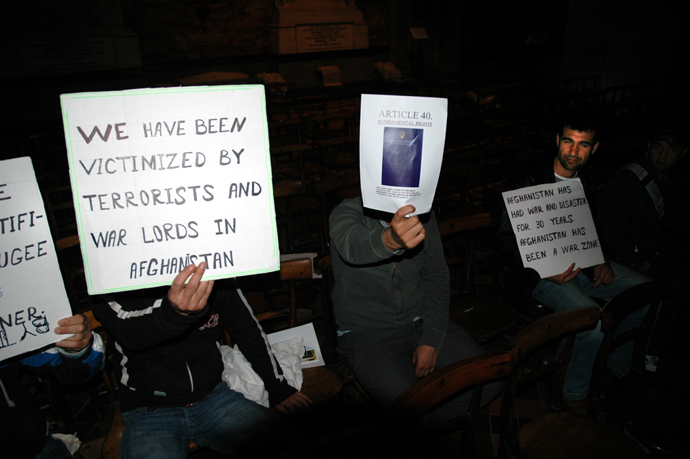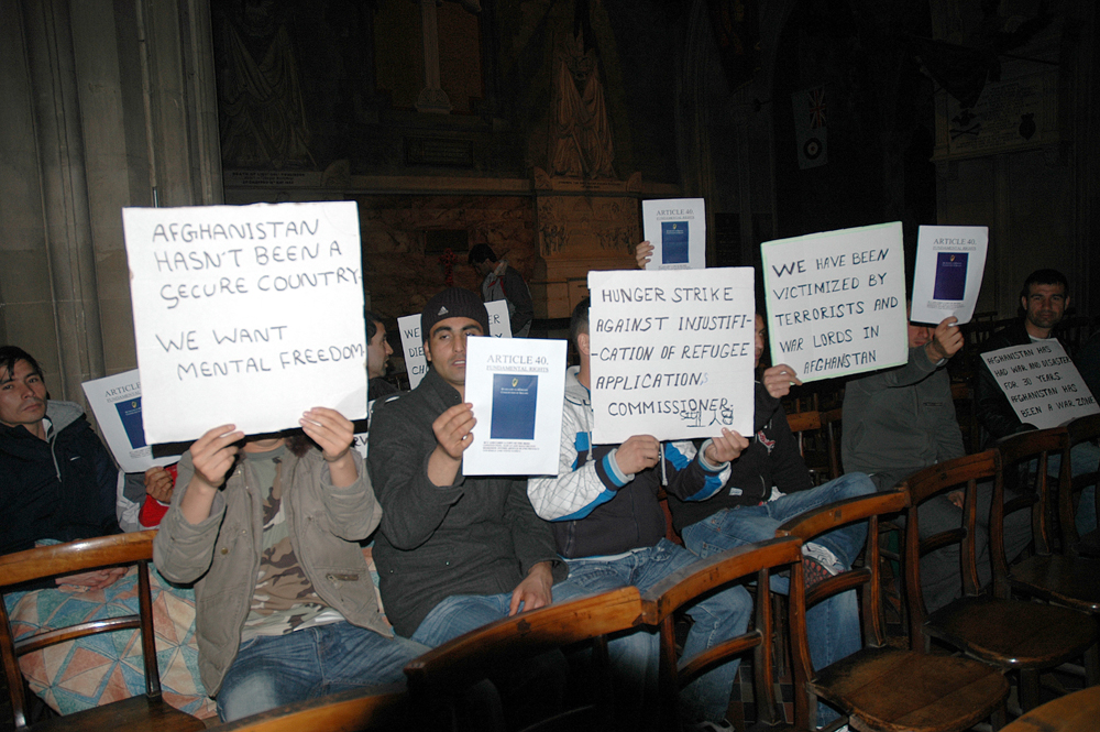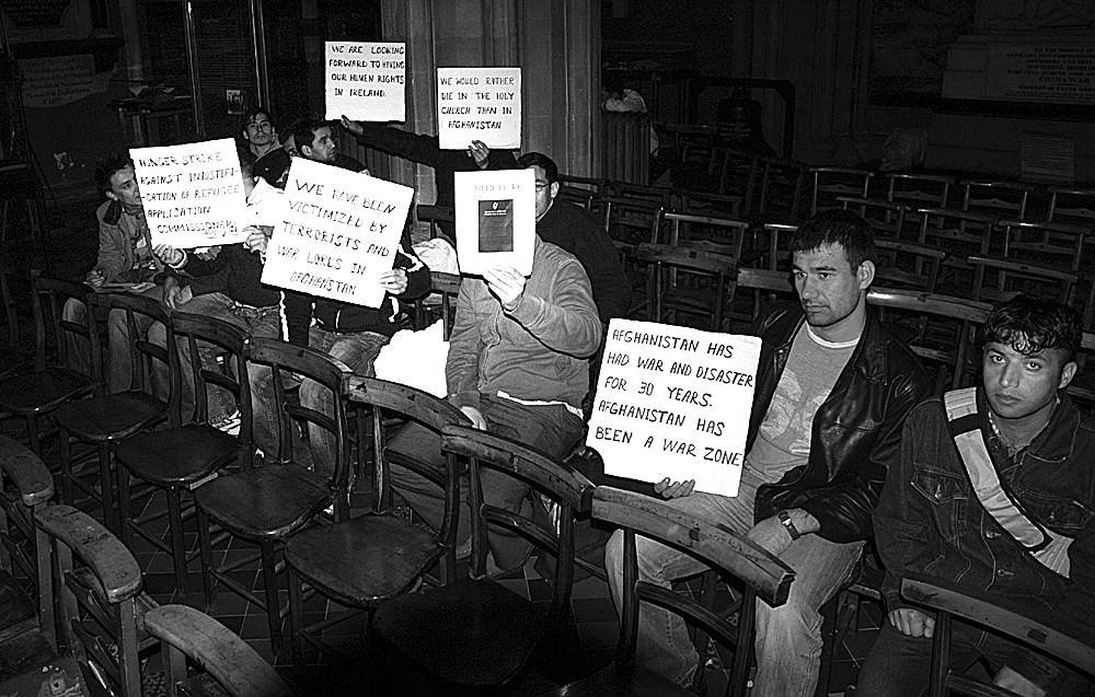 "33 Afghans all men are locked in St. Patricks Cathedral for the night. They say they will remain on huger strike until death. They are all Asylum seekers turned down on appeal. The Department of Justice said they would meet them tomorrow if they left tonight. They have refused. The Dean and Chaplain were very helpful, the Dean tried to contact McDowell without success and we heard him say Asylum Seekers are treated very badly in this country. Ciaran Cuffe TD and Aengus O'Snoddaigh TD will contact McDowell tomorrow. Many of these men were wounded in Afghanistan indeed one one was even blinded over there. All are anti-Taliban and fought against them."