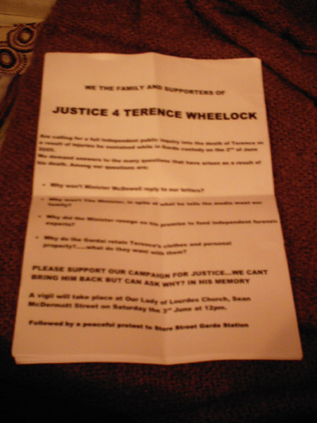 Justice for Terence Wheelock Terence (aged 20) died of injuries sustained at Store St Garda station on the 2/6/05 in very suspicious circumstances. Support the call for a full public independent inquiry in to this tragic death. Saturday 9th of June, 1 pm Meeting at Lourdes Chapel .... Sean McDermot St. March takes place through the North Innercity and will arrive at Store St garda station, where a petition to the new Minister for Justice will be signed by the community and supporters. The Campaign for Truth needs your support.