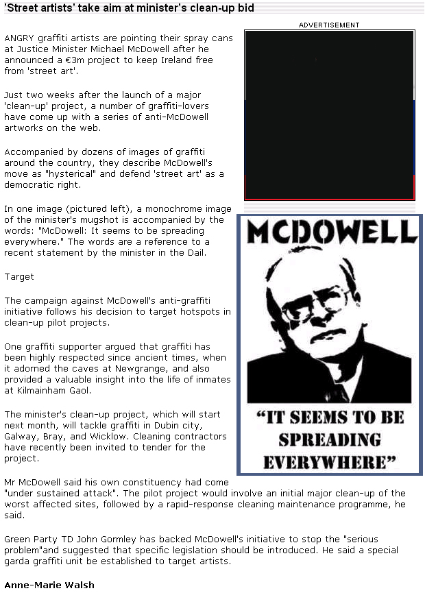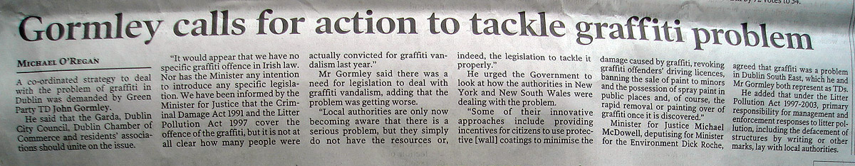 Deputy Gormley also asked “why have we seen an upsurge in graffiti throughout Dublin? We cannot afford to underestimate the extent of this problem.” In response to Mr. Gormley, Justice Minister Mr. McDowell (standing in for his colleague the Minister for the Environment, Heritage and Local Government, Deputy Roche) replied, “The constituency Deputy Gormley and I share has been under sustained attack in recent times. It seems to be spreading everywhere.” He also went on to say “Somebody, on doing a little research, should be able to track down where the major sales of spray paint are taking place and to whom it is being sold.” Transcription of Dail Eireann Speech on Graffiti (8 Jun 2006) http://www.greenparty.ie/en/in_the_dail/speeches/8_jun_...ffiti