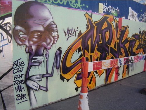 If graffiti is sooo much of a problem 2 the goverment or whoever deals with the removel of graffiti then why would shops an orginisations be aloud 2 destroy the city with their crap wheat pastes about concerts, whereas they could easily post their information on the internet as if their runnin an concert it would require a bit of money so im sure they could spare some 4 advertisment instead of puttin these leaflets an posters out. I would rather see a colourful tag on a green box than some teared up poster that u cant even read. While graffiit may get buffed over time these posters still remain on walls, lamposts and whatever else they can stick too. I think every1 will agree that the vogue wall is much more attractive than this advertisment balls. So to make a conclusion. Y dont you just let graffiti ffs. And by the way graffiti is not some stupid kid writin their name on a wall thats vandalism. Graffiti is a culturean is taking very seriously by many people.