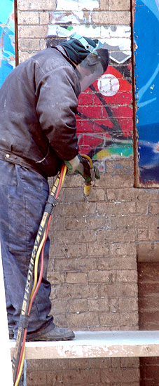 Since last year in Barcelona we've been battling a load of "civic law" measures which probably translated as "anti-social laws". They were finally adopted on the 23/12/05 but we stopped them being "published" as law for a further month. Basically they overturned the municipal climate which had fostered an "open city" before, (and of course wonderful grafitti and street music). We are still sueing the council over many elements of the package (more to do with street vendors, mendigents, prostitutes &c..,) but it is really interesting to see how much it cost & is continuing to cost the council to clean less than 25% of the city area of grafitti and the recently more popular poster art or sticker combination (such as the image above uses) :- In 6 months the council has spent over 70 million Euros, this includes the cost of creating "anti-grafitti" teams who have used over 80 tonnes of solvent to clean the walls & then paint them all the same colour. I really wonder where the wisdom is in that is, considering that those 80 tonnes of solvent have gone into our drainage system which frankly was under strain before. Its certainly nice to see some people have a job, but they need to mask up and kit up because the solvents are poisonous... I ocassionally write letters wondering if 70,000,000 would have built playgrounds, started art classes or.......... put filtration systems into our drainage.