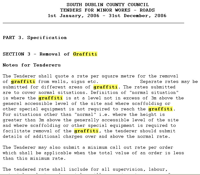 i can not get over the fact that the government is spending millions on geting rid of graffiti.......ther even spending money on a vandalism squad when half of irelands water suplies arent even half as good as a third world country ,the roads are some of the worst i have ever seen and a large number of schools are allmost falling down , why dont the spend ther money on sorting out real problems instead of geting rid of some paint on a wall