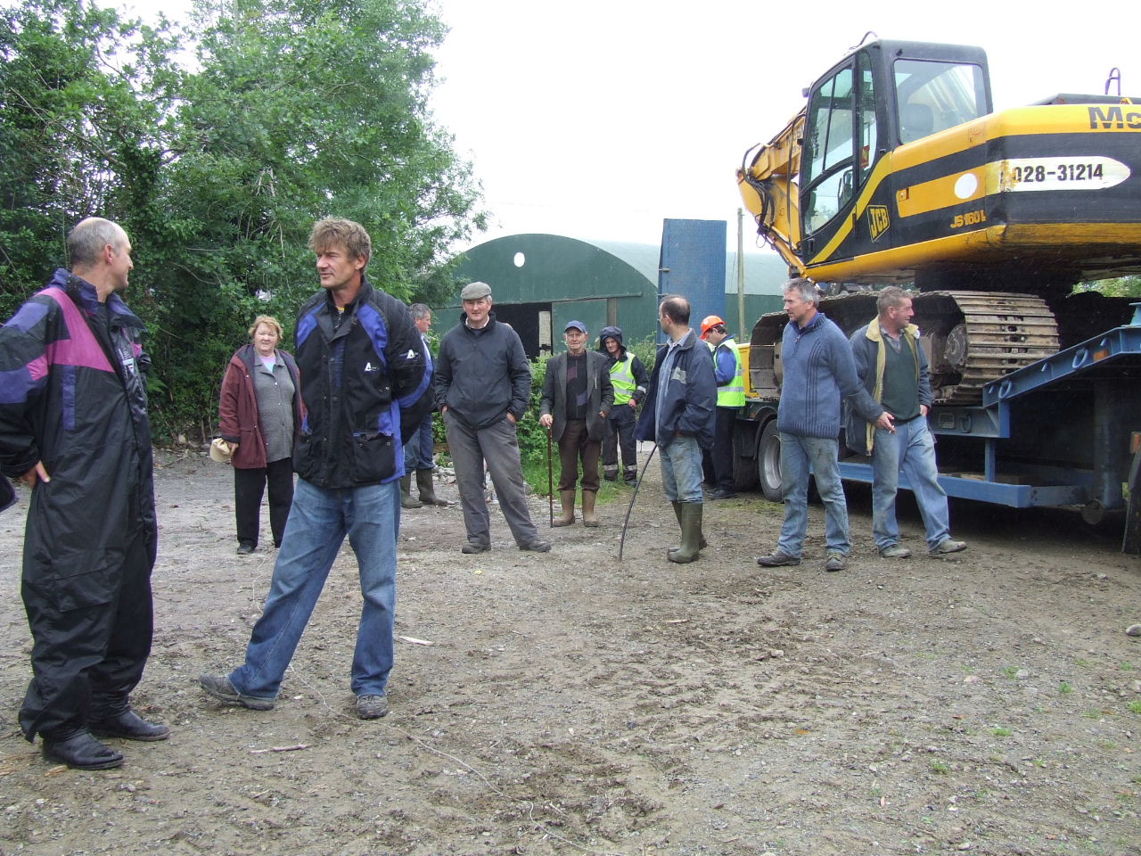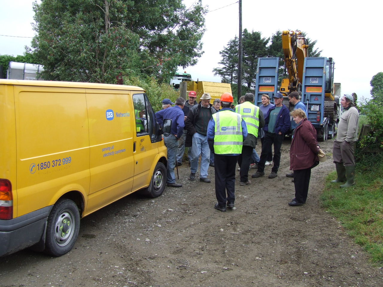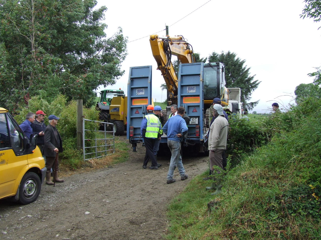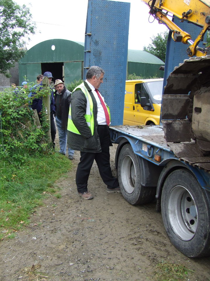 Before they knew it, Liam O’Sullivan had his car parked on the Burke’s driveway up close to the house and contractor Pat McSweeney had his low-loader truck and digger through the gates to the land and up the track ready to start work. More ESB vehicles - the truck carrying the poles, a van and jeep were out parked on the road with an ‘SAG Energy Technologies’ van (http://www.sag.de) kinda hidin’ back further down the road. Two squad cars and a number of Gardaí parked in the driveway close to the road. Within minutes a number of local residents and visiting supporters had arrived to block the digger truck and the vehicles on the road from entering the farm. The gate was closed and a tractor and baling machine were parked behind the digger truck it to keep it right where it was until negotiations could begin.