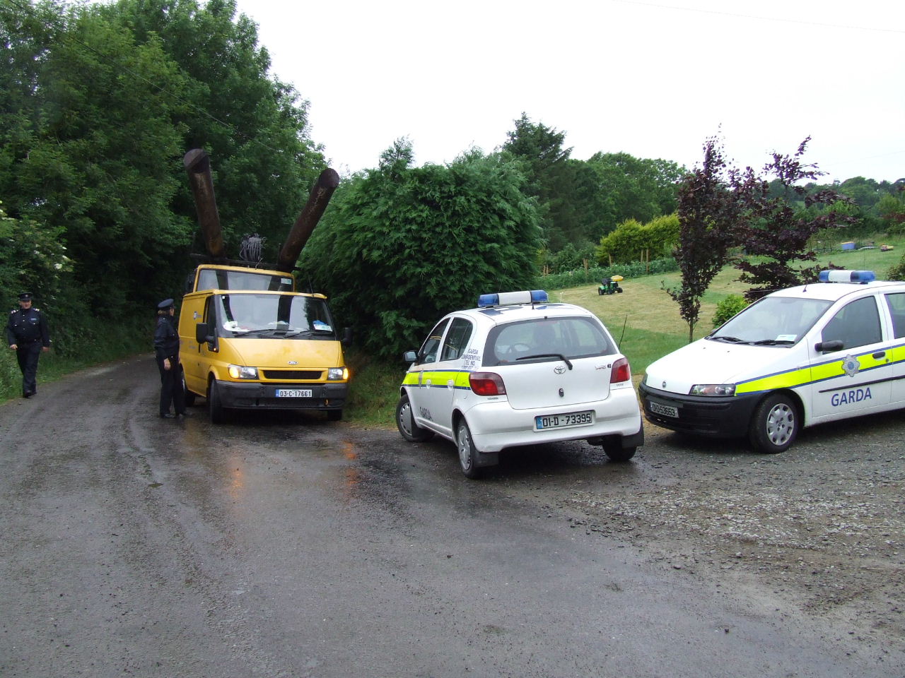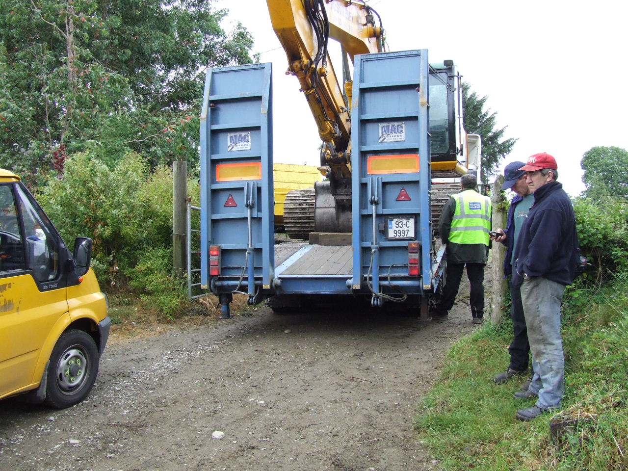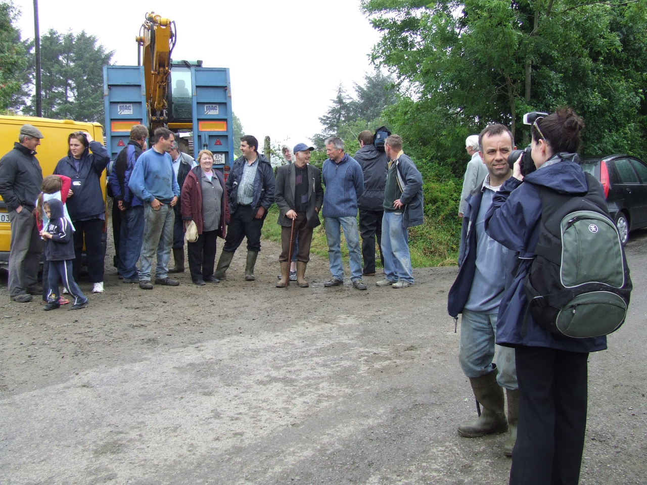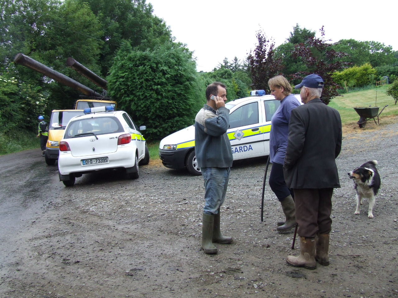 Before they knew it, Liam O’Sullivan had his car parked on the Burke’s driveway up close to the house and contractor Pat McSweeney had his low-loader truck and digger through the gates to the land and up the track ready to start work. More ESB vehicles - the truck carrying the poles, a van and jeep were out parked on the road with an ‘SAG Energy Technologies’ van (http://www.sag.de) kinda hidin’ back further down the road. Two squad cars and a number of Gardaí parked in the driveway close to the road. Within minutes a number of local residents and visiting supporters had arrived to block the digger truck and the vehicles on the road from entering the farm. The gate was closed and a tractor and baling machine were parked behind the digger truck it to keep it right where it was until negotiations could begin.