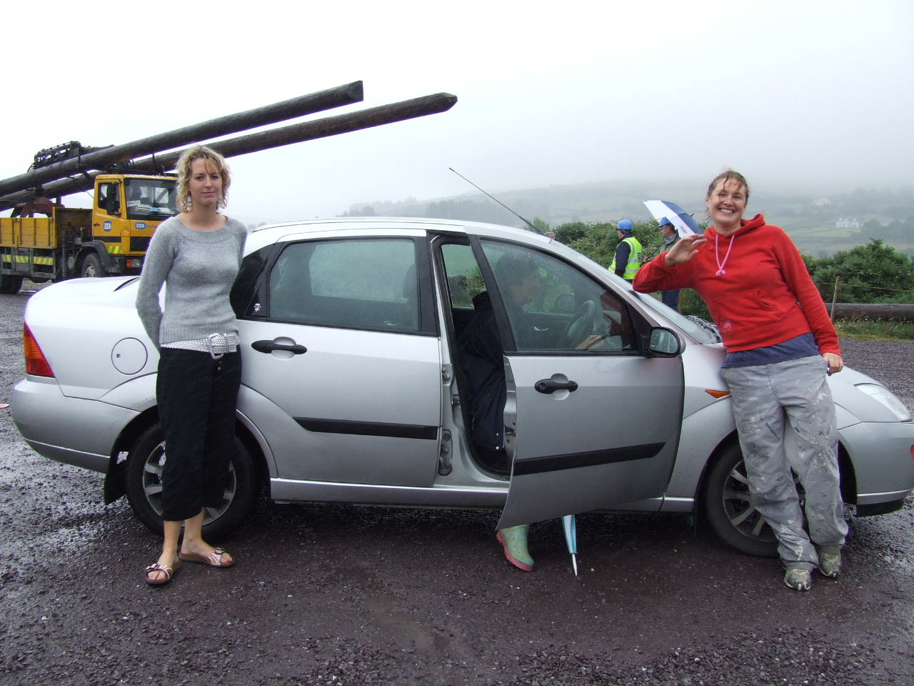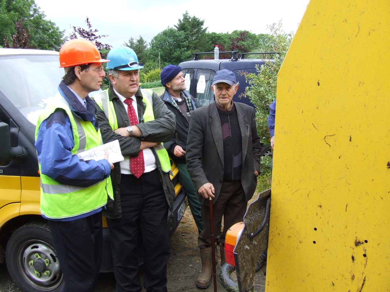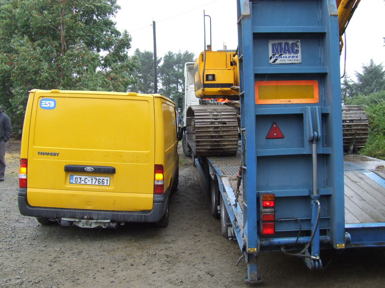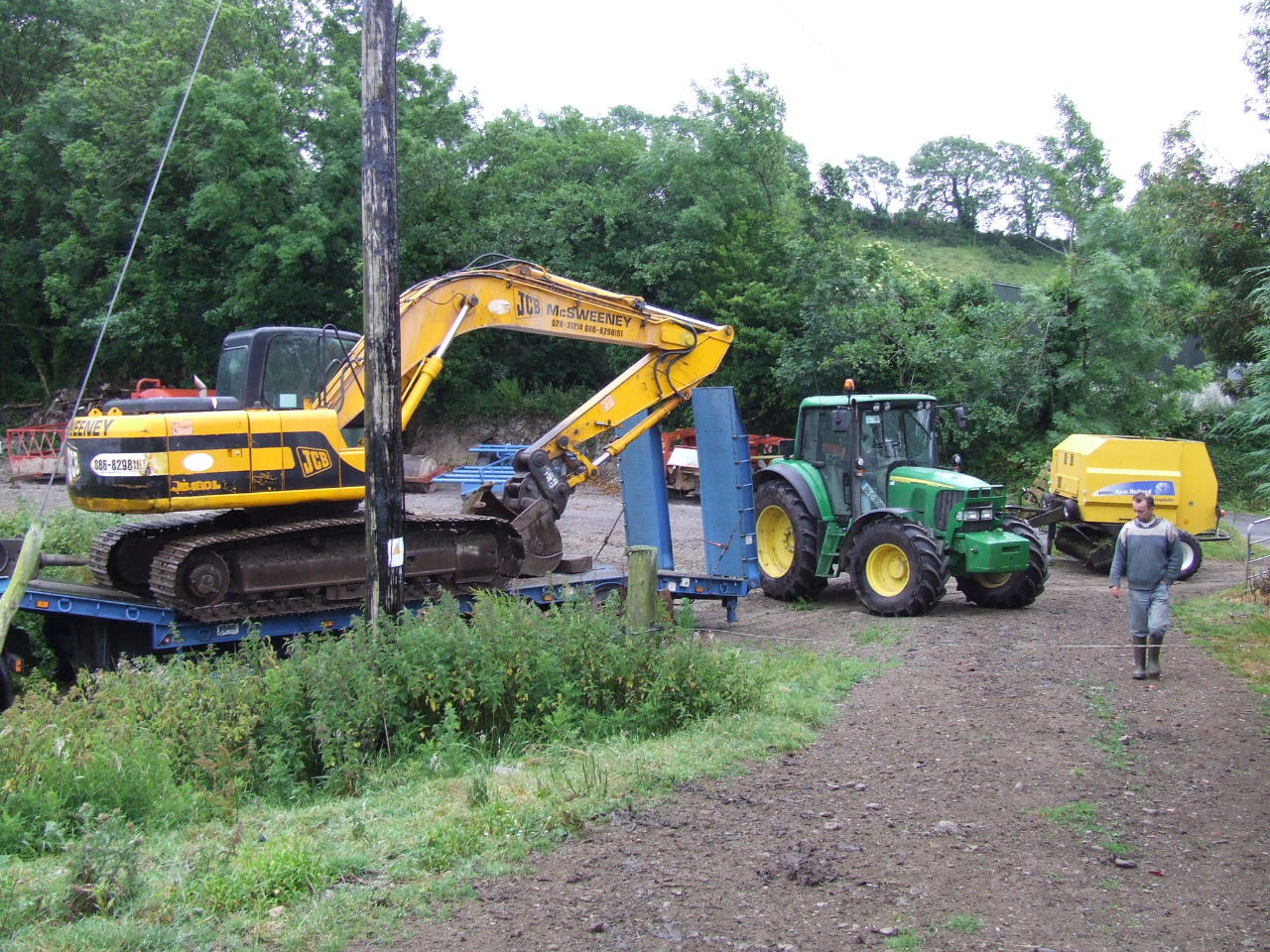 Before they knew it, Liam O’Sullivan had his car parked on the Burke’s driveway up close to the house and contractor Pat McSweeney had his low-loader truck and digger through the gates to the land and up the track ready to start work. More ESB vehicles - the truck carrying the poles, a van and jeep were out parked on the road with an ‘SAG Energy Technologies’ van (http://www.sag.de) kinda hidin’ back further down the road. Two squad cars and a number of Gardaí parked in the driveway close to the road. Within minutes a number of local residents and visiting supporters had arrived to block the digger truck and the vehicles on the road from entering the farm. The gate was closed and a tractor and baling machine were parked behind the digger truck it to keep it right where it was until negotiations could begin.