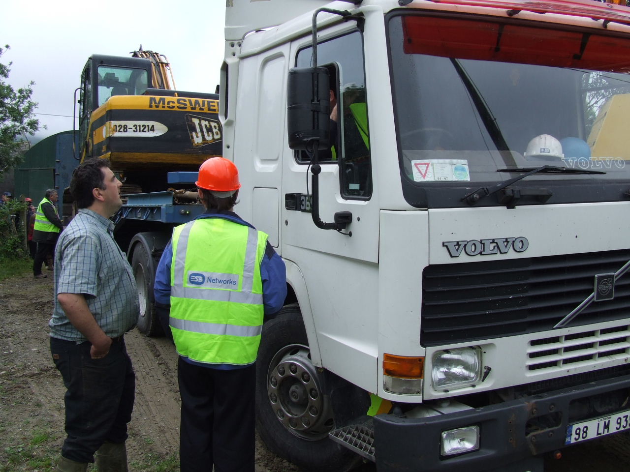 The ESB were told in no uncertain terms that they had no permission to access Burke’s farm. They were told to leave and take their machines and cars with them, but they refused, rudely. When contractor Pat McSweeney agreed to take away his digger truck, Joe opened the gate for him and removed his own machinery which was in his way. Pat Mc Sweeney started to reverse his digger back down the track towards the gate. When he got to the gate, and when the truck was right in between the gate posts … Liam O’Sullivan appeared at the side of the truck signalling him to stop … and then he stuck his feckin’ foot under one of the wheels of McSweeney’s truck!.. stopping him there and blocking the gate.