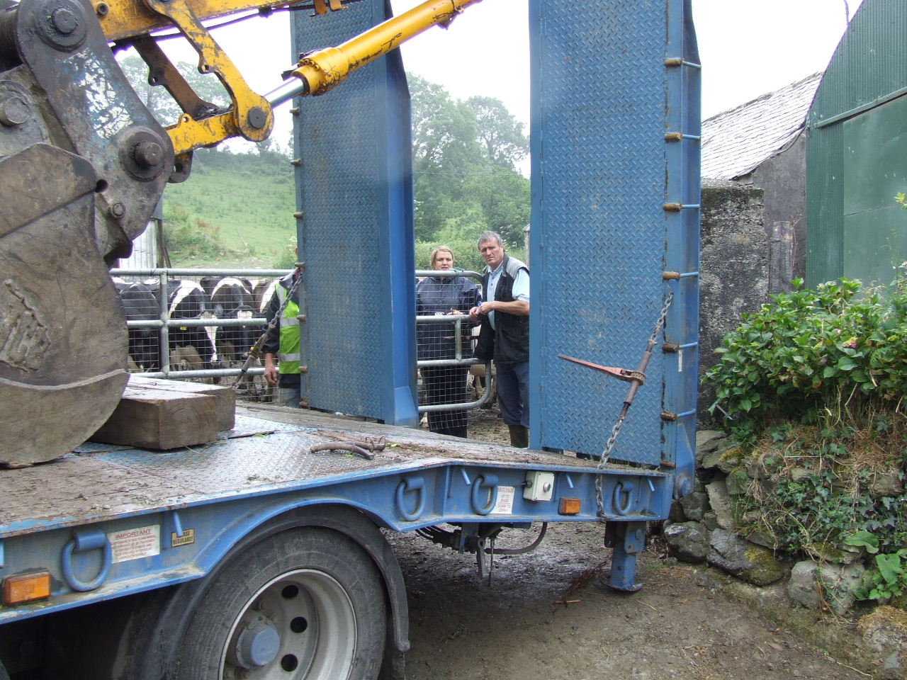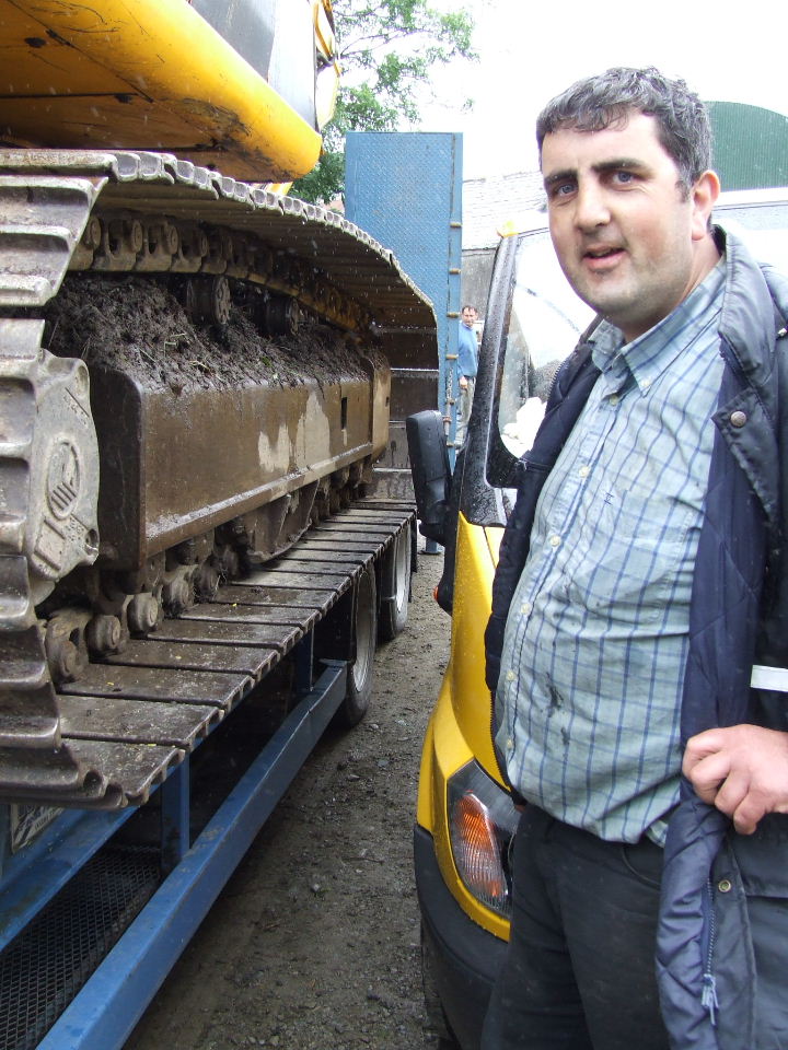 Contractor Pat Mc Sweeney had fierce trouble backing out that long low-loader digger truck with Liam O’Sullivan refusing to budge. It took him nearly half an hour and he had to reverse back through the gate across the road and into the cows before he could pull away. Finally, the cows got out to feed.