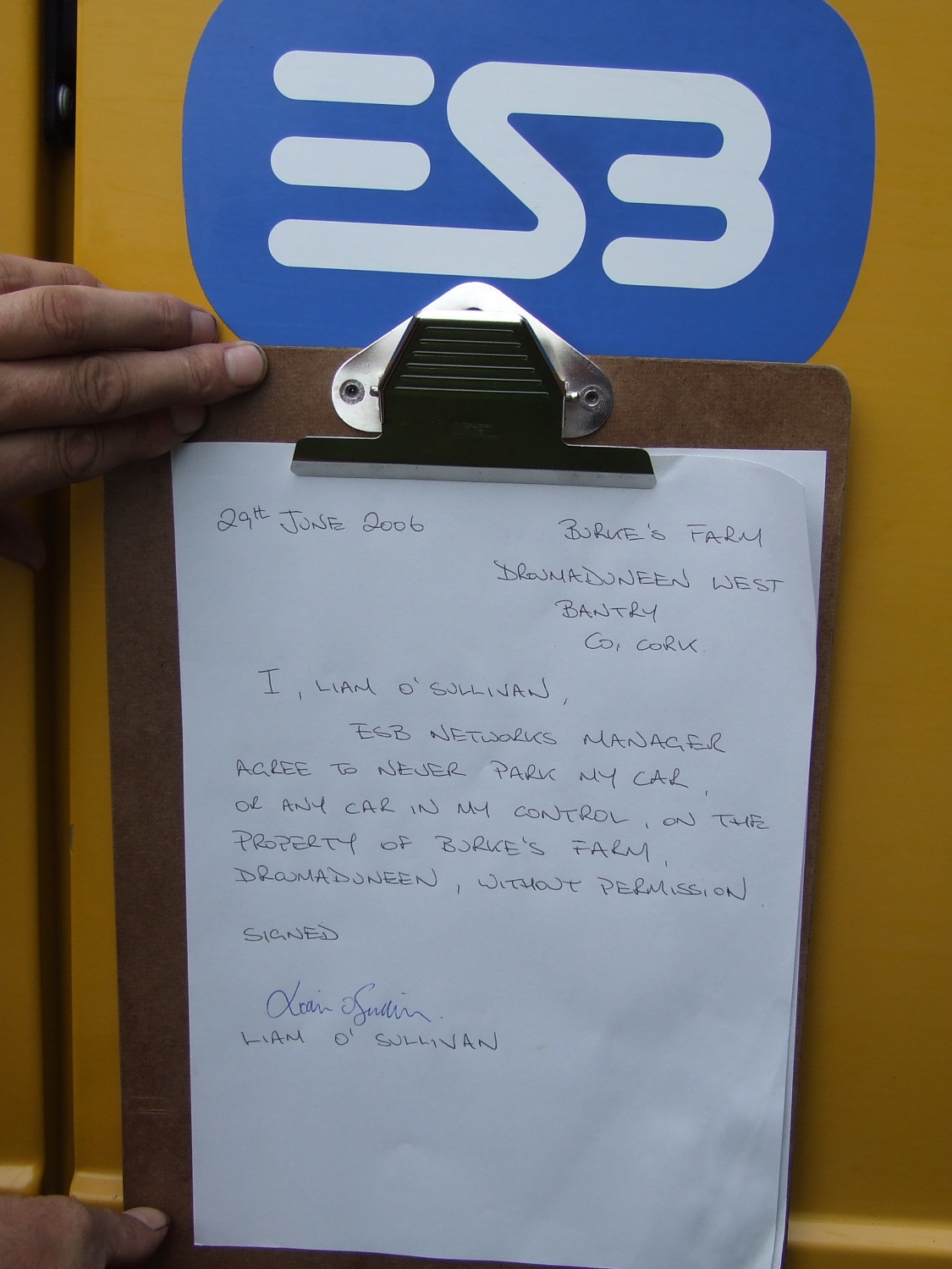 Meanwhile, Liam O’Sullivan’s car which was parked close to the house was blocked in by some of the many cars that had come to Burke’s farm in support of them. As the afternoon progressed and a successful blockade had kept the ESB out, Liam O’Sullivan tried to move his car without success. He was told that he could take out his car on one condition only … that he agree to sign a statement saying that he would never park his car on Burke’s property without permission again. Without going into detail of his protestations at that and his attempts to use the Gardaí to assist him, suffice to say … he signed!