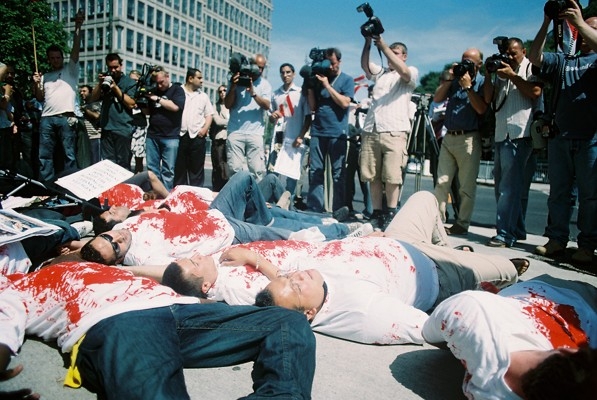 The Israeli Embassy in Dublin was confronted on Tuesday with the death and destruction that it has wrought in Gaza and Lebanon in recent weeks. During its all-day vigil at the Israeli embassy, the Ireland-Palestine Solidarity Campaign (IPSC) held a symbolic “die-in”, in which Irish, Lebanese and Palestinian volunteers donned “blood”-stained clothes and lay down on the street in front of the embassy. All Irish local and national media were present and gave the protest prominent coverage across the day and in Wednesday’s newspapers. The demonstration was a prelude to a major march taking place in Dublin this coming Saturday 29th. The conflict has entered its third week, and the scale of Israel's attacks has meant that almost 10 Lebanese have died for every Israeli, as at this stage over 400 Lebanese and 42 Israelis have been killed. Many of the dead on both sides are civilians, and under international law, any targeting of civilians is a war crime. On the day of the protest, four UN observers were killed by an Israeli bomb in south Lebanon. Other indymedia.ie coverage of the conflict: Irish activist Caoimhe Butterly travels to Lebanon | Did Hezbollah really breach the border? | Lebanese media targeted | Israel uses White Phosphorus and cluster bombs against civilians | Lebanon and Shannon airport | Belfast protest | Other coverage: Global IMC Feature | Robert Fisk in Beirut via Demoracy Now | Chomsky on current conflict | Audio: 1 2 3